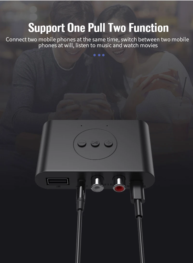 2. Enlace de dispositivo dual: Empareje simultáneamente su teléfono inteligente y tableta y Transmita música desde cualquiera de ellos con cualquier sistema estéreo que admita un conector estándar de 3,5mm o RCA. Conecta dos dispositivos Bluetooth a la vez para escuchar música, hacer llamadas telefónicas y más.