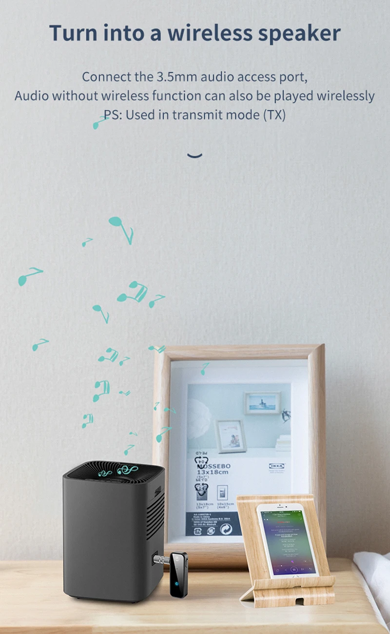 • Dongle USB:El diseño compacto dongle USB hace que sea fácil de transportar y usar sobre la marcha, perfecto para viajes o streaming de música.