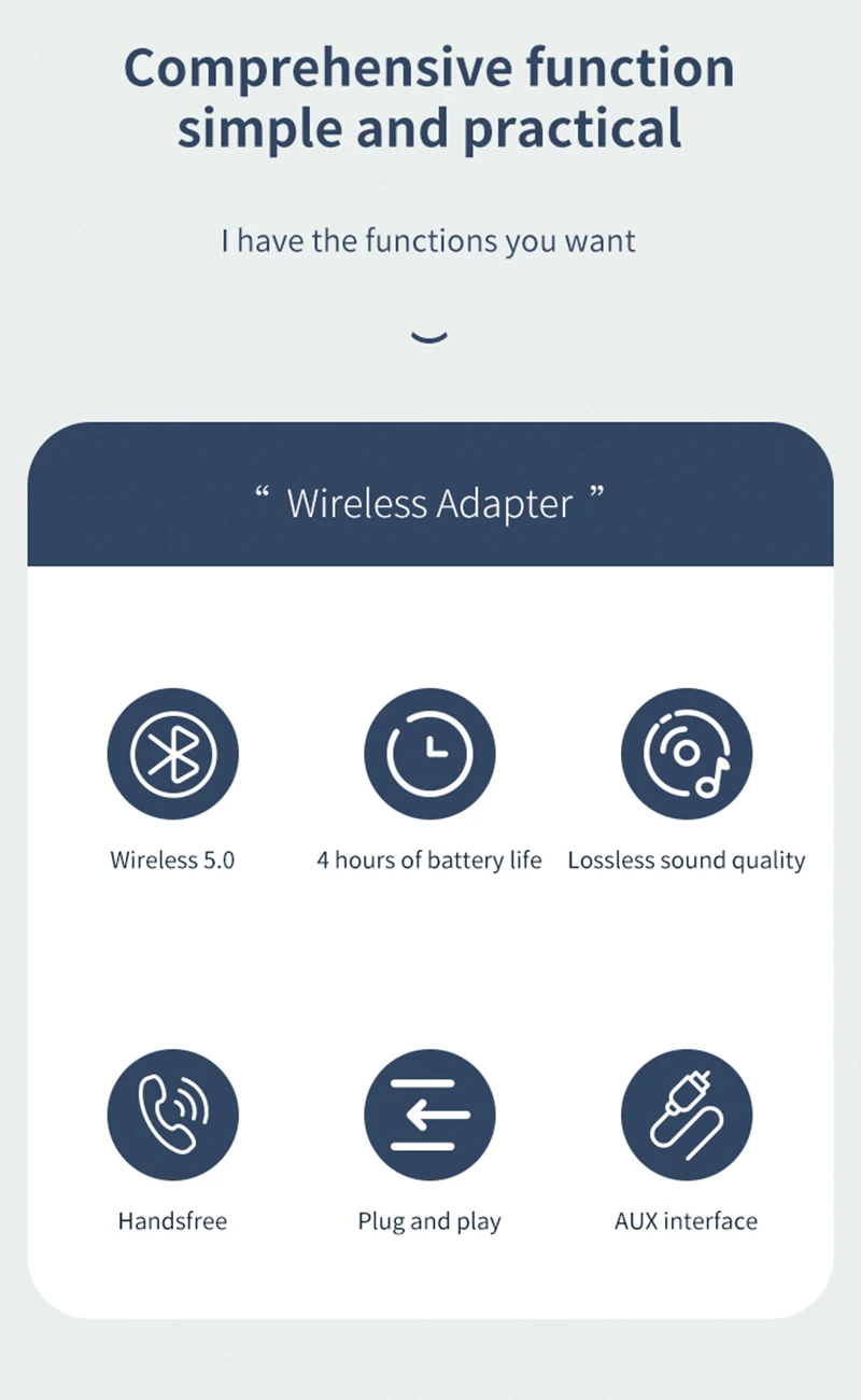 1. Bluetooth compatible:Este Adaptador de audio Bluetooth admite audio auxiliar de 3,5mm, y también es compatible con todos los teléfonos inteligentes, dispositivos de audio Bluetooth (auriculares Bluetooth, altavoces Bluetooth y mucho más) y equipos estéreo con puerto de entrada de audio. Al presionar el botón en el frente central, el dispositivo receptor y transmisor comenzará a emparejarse con el siguiente dispositivo Bluetooth.