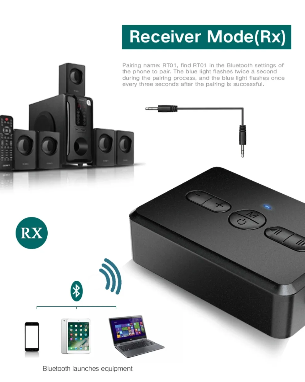 2) que está en modo TX Confirme (luz roja intermitente). El RT01 buscará automáticamente auriculares Bluetooth o emparejamiento de altavoces Bluetooth. Después de que el emparejamiento sea exitoso, el sonido del televisor o la computadora se puede transmitir a los altavoces Bluetooth y otros dispositivos a través de RT01 para su reproducción.