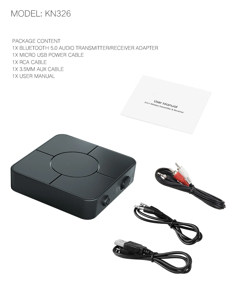 El KN326 tiene solo 44mm (1,73 ") de ancho y pesa solo 18g (0,63 oz), pero tiene potentes capacidades de transmisión de audio inalámbrico. Deslice este transmisor y receptor en su mochila o bolsa de portátil y llévelo sin el más mínimo esfuerzo.