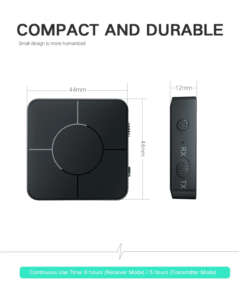 4. Cambie entre los modos transmisor y receptor con el simple cambio de un interruptor. Se conecta sin esfuerzo con tecnología Bluetooth avanzada y cable de audio de 3,5mm (incluido).