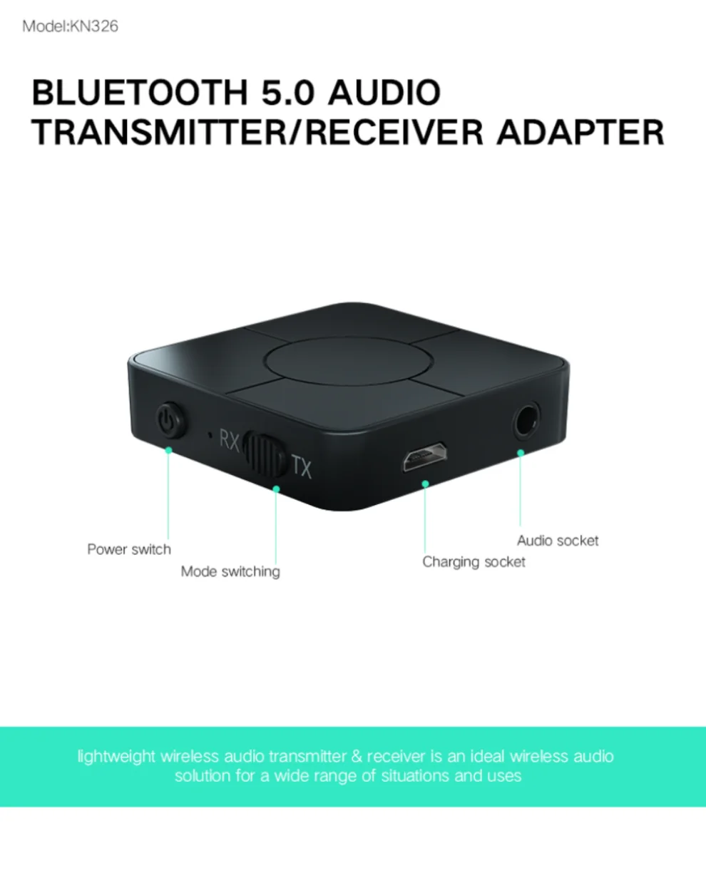 El KN326 tiene solo 44mm (1,73 ") de ancho y pesa solo 18g (0,63 oz), pero tiene potentes capacidades de transmisión de audio inalámbrico. Deslice este transmisor y receptor en su mochila o bolsa de portátil y llévelo sin el más mínimo esfuerzo.