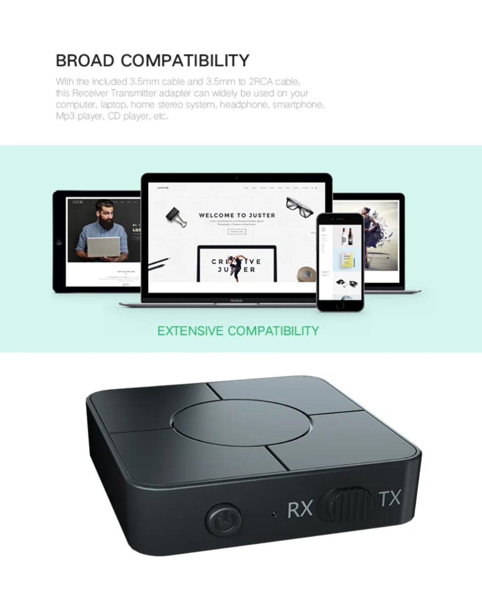 6 amplia compatibilidad: con el cable de 3,5mm incluido y el cable de 3,5mm a 2RCA, este adaptador de transmisor receptor se puede utilizar ampliamente en su computadora, computadora portátil, sistema estéreo doméstico, auriculares, teléfono inteligente, reproductor Mp3, reproductor de CD, etc.