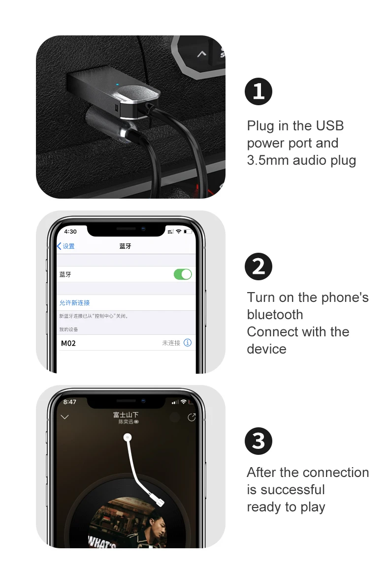 7. En comparación con el transmisor Bluetooth FM, la transmisión de señal a través del puerto auxiliar es más estable, más rápida y la conexión Bluetooth es más simple (porque el transmisor Bluetooth FM es un teléfono móvil conectado al transmisor a través de Bluetooth, Y luego el transmisor se conecta al equipo de altavoces en el automóvil a través de FM, Entre los cuales hay más transferencias, y FM es fácil de ser interferido por ondas de radio. Este es un Bluetooth del teléfono móvil conectado al receptor. El receptor está conectado directamente al dispositivo de audio a través del cable, por lo que la señal de transmisión será mejor y la conexión será más fácil)