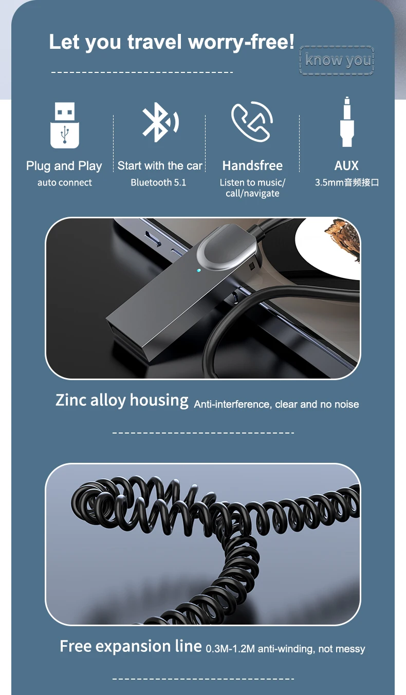 8. En comparación con la necesidad de un adaptador de 3,5mm para conectarse al adaptador Bluetooth, el adaptador es fácil de perder. Este tiene una línea de resorte de 1,2 m, que es fácil de almacenar y usar (el resorte no se estira 30cm)