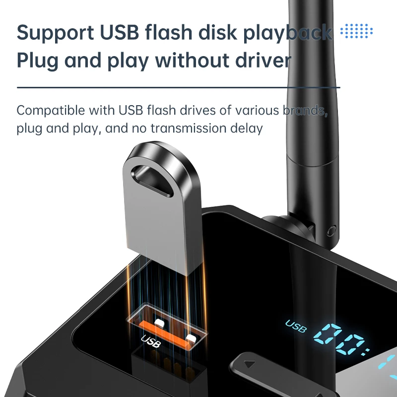 Después de encender, inserte el disco U en la interfaz USB, puede reproducir directamente el contenido del disco U y presione brevemente la canción anterior/siguiente para seleccionar una canción. En el modo de disco U, presione brevemente la tecla de conversión para cambiar al modo inalámbrico. (Es necesario enchufar un cable de audio de 3,5mm en todos los modos).