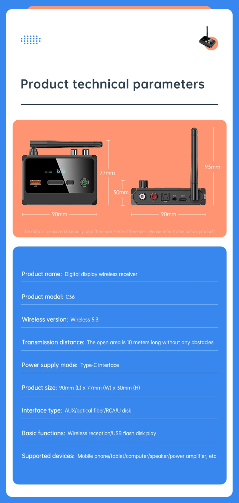 【Admite reproducción de U-disk 】El adaptador Bluetooth para RECEPTOR ESTÉREO se ofrece para la ranura U-disk. ¡Puede elegir jugar desde su dispositivo inteligente o U-disk! No importa si está utilizando un altavoz antiguo, un estéreo vintage o un receptor con cable, puede convertir fácilmente la música en inalámbrica a través de los cables de 3,5mm o RCA del receptor de audio Bluetooth.