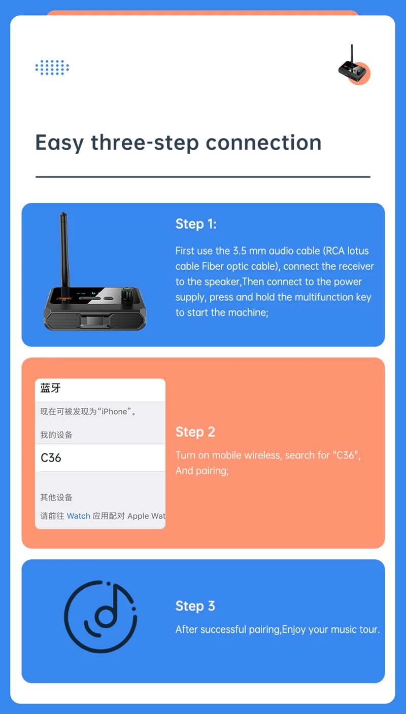 【Fácil de usar】 Fácil de conectar, Emparejar y reproducir. Conéctelo a altavoces, sistemas estéreo domésticos u otros estéreos de automóvil a través del cable AUX o RCA de 3,5mm, luego empareje el receptor Bluetooth con los dispositivos de audio Bluetooth como teléfonos inteligentes o tabletas. Después de eso, puedes disfrutar de la música.