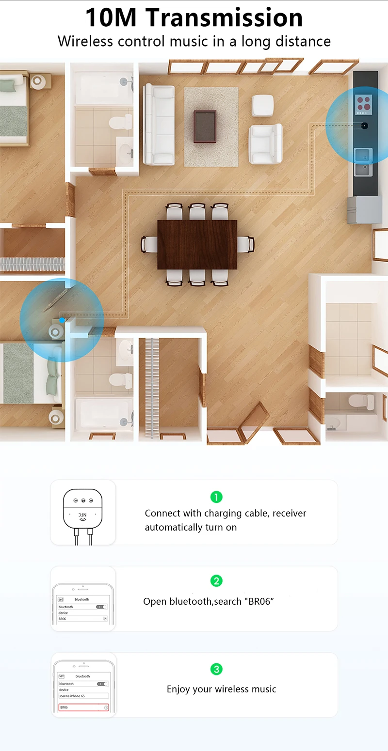 5. Transmisión de música inalámbrica: transmite música en estéreo a auriculares y parlantes que no son Bluetooth.