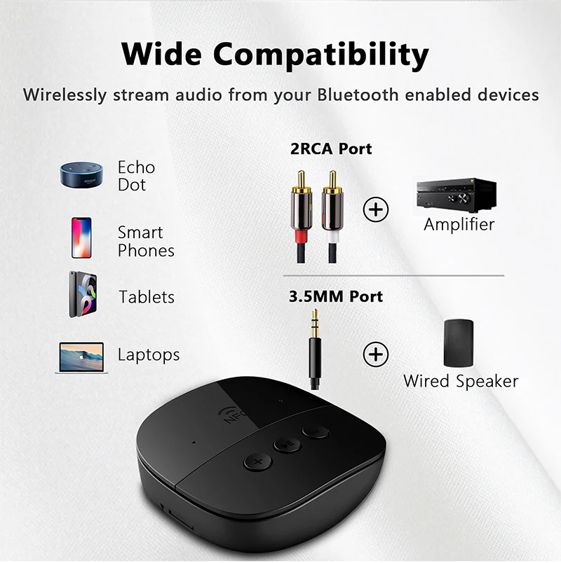 7. Conexión súper estable: nuestro adaptador de audio Bluetooth está equipado con un chip Bluetooth 5.2 para un emparejamiento estable, transmisión rápida y un amplio rango de señal (33 pies).Con el puerto AUX de 3,5 mm y 2 puertos RCA, se puede conectar a sistemas de audio para automóvil que no sean Bluetooth, estéreo doméstico, auriculares/altavoces con cable, amplificador/cine en casa, etc.¡Entonces podrás disfrutar de la transmisión inalámbrica de música Hi-Fi!
