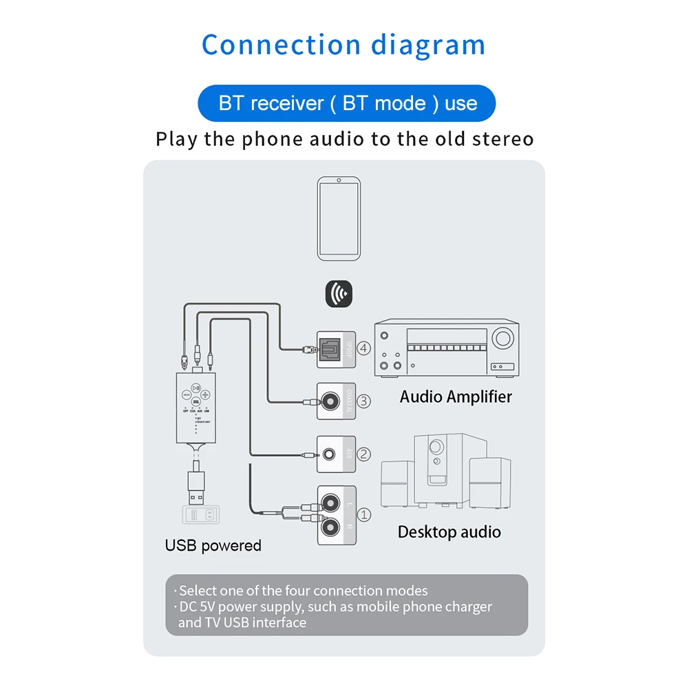 2.Conexión a altavoces o amplificadores antiguos:Los receptores de componentes de audio estéreo pueden resolver el problema de los altavoces sin Bluetooth y no se pueden reproducir usando Bluetooth a través de la interfaz AUX/RCA o la interfaz de fibra coaxial de altavoces o amplificadores antiguos.
