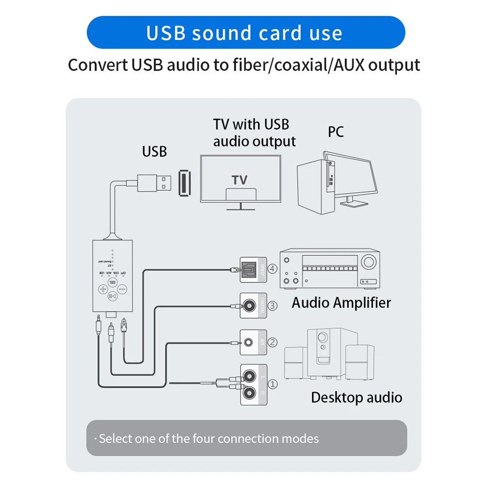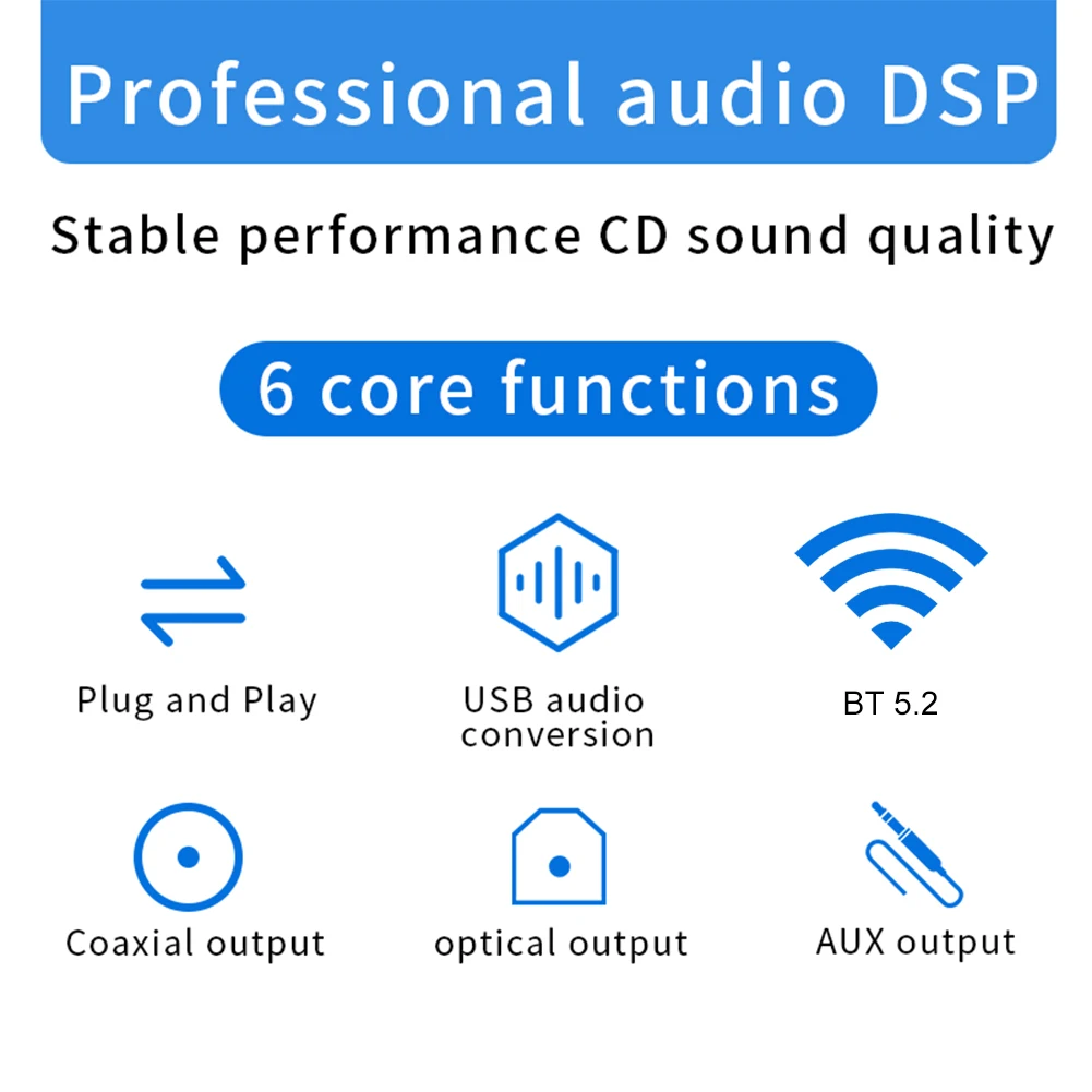 3.Función:Los receptores de componentes de audio estéreo pueden convertir audio digital USB de computadora/TV en salida de fibra óptica/coaxial/AUX y luego conectarse a varios amplificadores de audio/potencia.