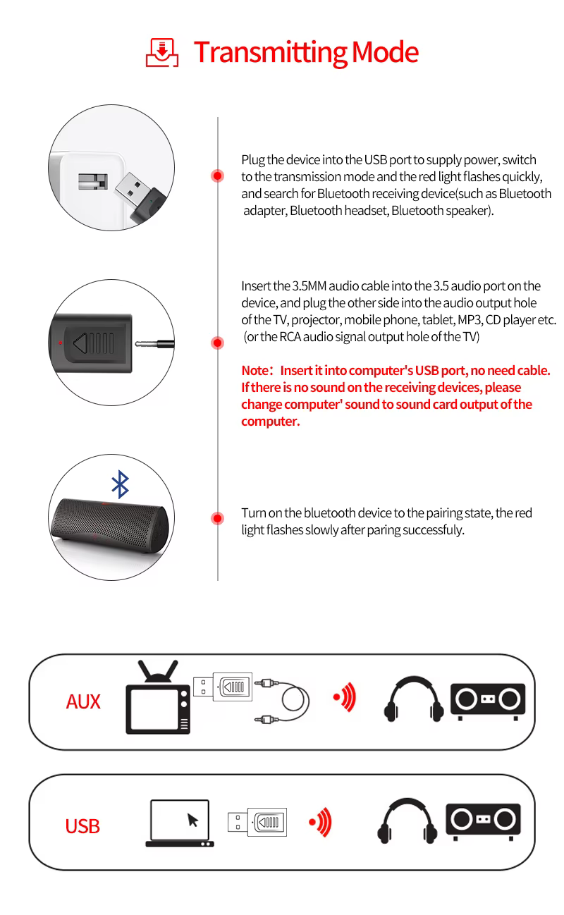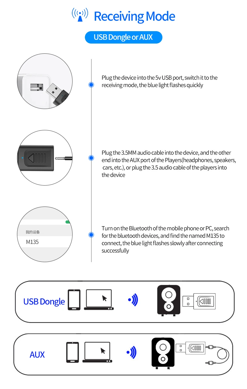 R: En modo transmisor (luz roja): debe usar el cable de audio de 3.5mm para conectar su TV A nuestro M135. Tenga en cuenta que el cable de 3,5mm debe conectarse a la salida de audio de 3,5mm de su TV/PC/tableta. En modo receptor (luz azul): debe usar el cable de audio de 3,5mm para conectar su amplificador/altavoz con cable/sistema de audio de automóvil con nuestro M135. Tenga en cuenta que el cable de 3,5mm debe conectarse a su amplificador/altavoz con cable/sistema de audio del automóvil Entrada de audio de 3,5mm.