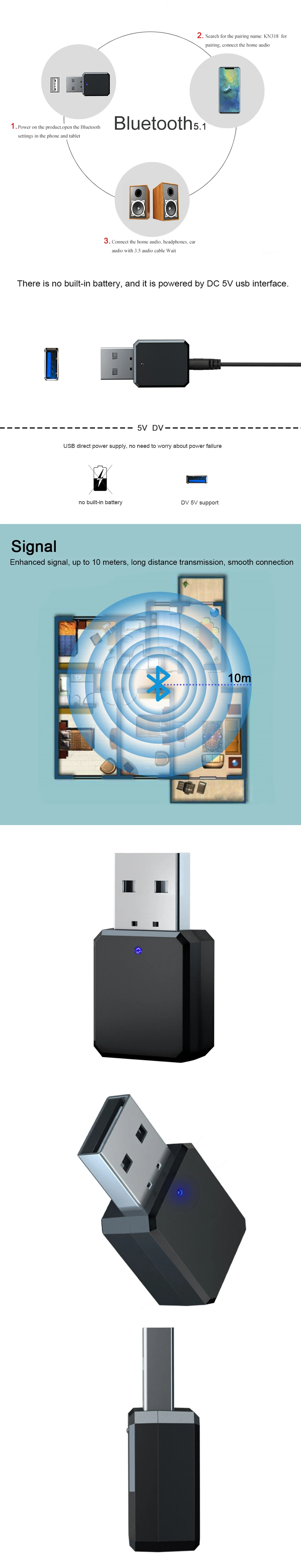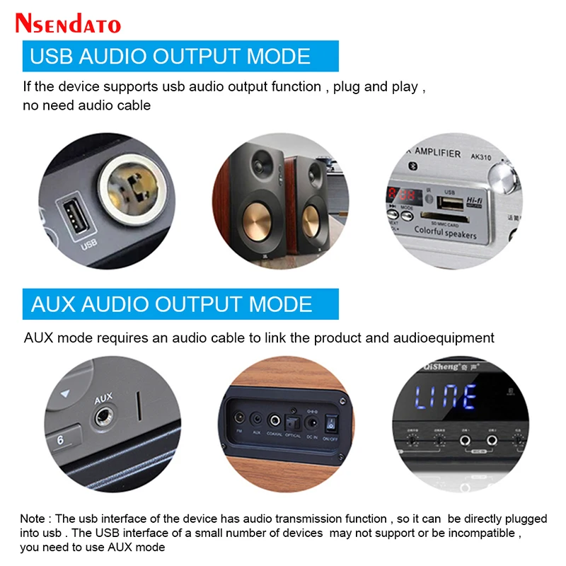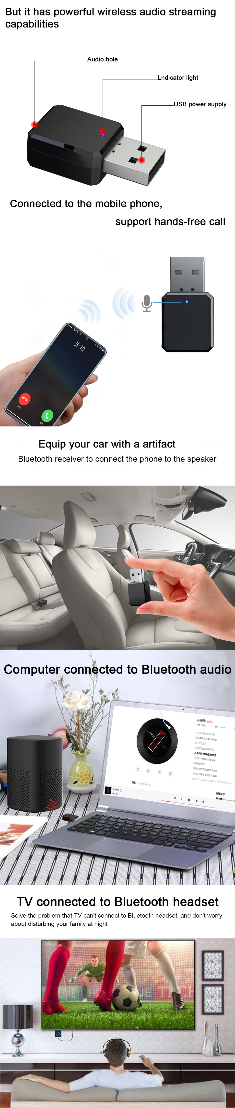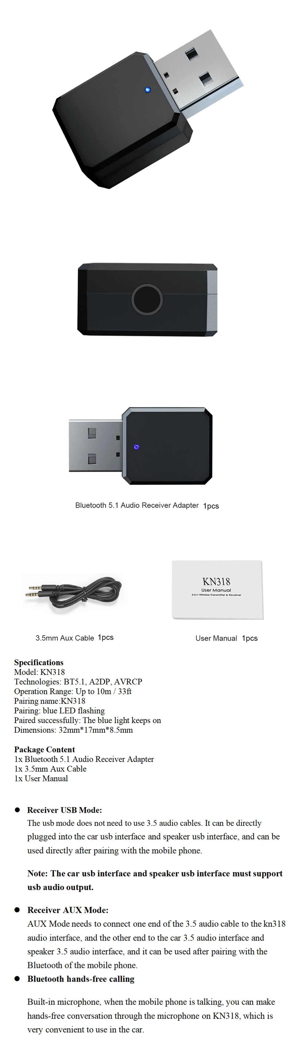 El modo usb no necesita usar cables de audio 3,5. Se puede conectar directamente a la interfaz usb del coche y la interfaz usb del altavoz, y se puede utilizar directamente Después de emparejar con el teléfono móvil.