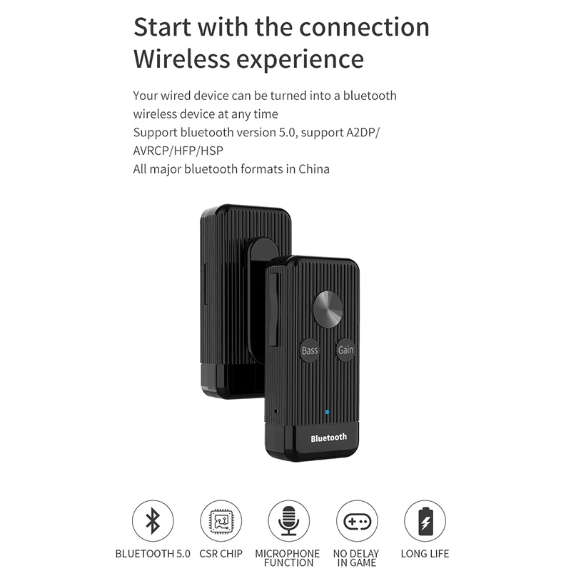1. Su dispositivo con cable se puede convertir en un dispositivo inalámbrico Bluetooth en cualquier momento, admite la versión 5,0 de Bluetooth, admite el formato Bluetooth A2DP/AVRCP/HFP/HSP