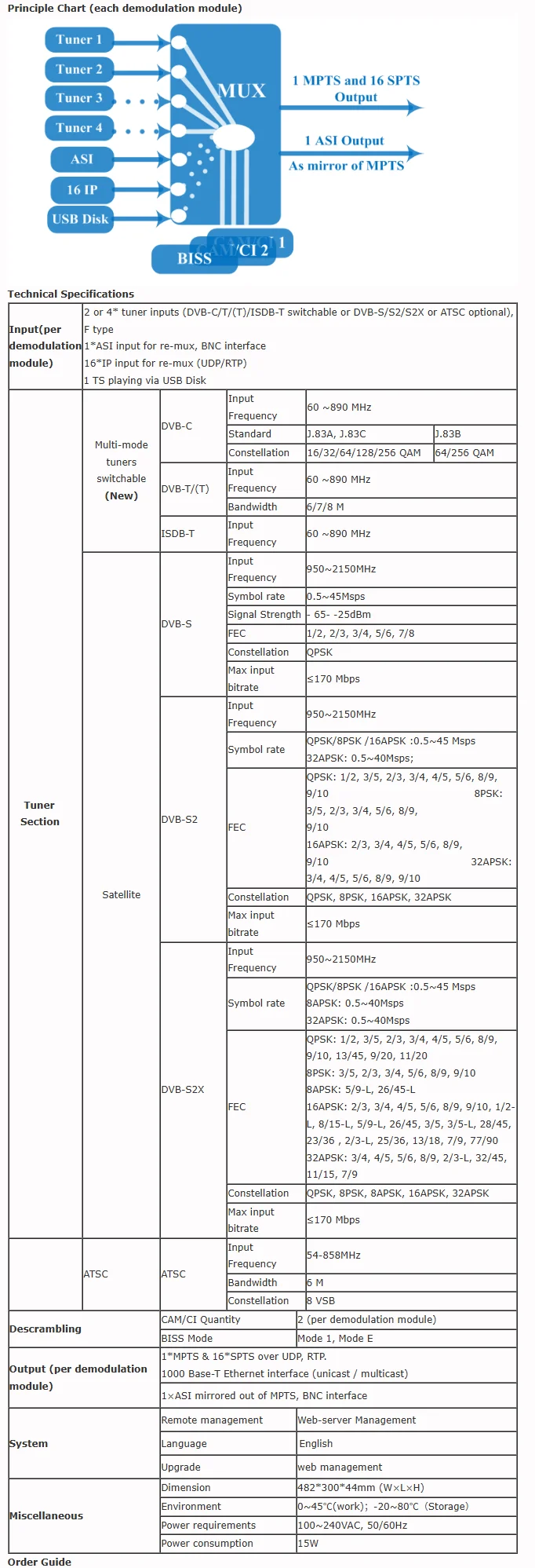 Entradas sintonizador 2*4 (DVB-C/T/ISDB-T conmutables o DVB-S/S2/S2X o ATSC opcionales) para cada módulo de demodulación
