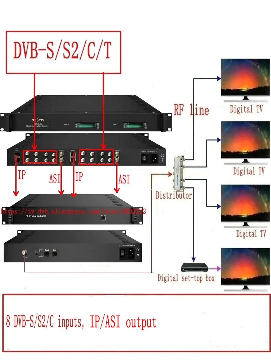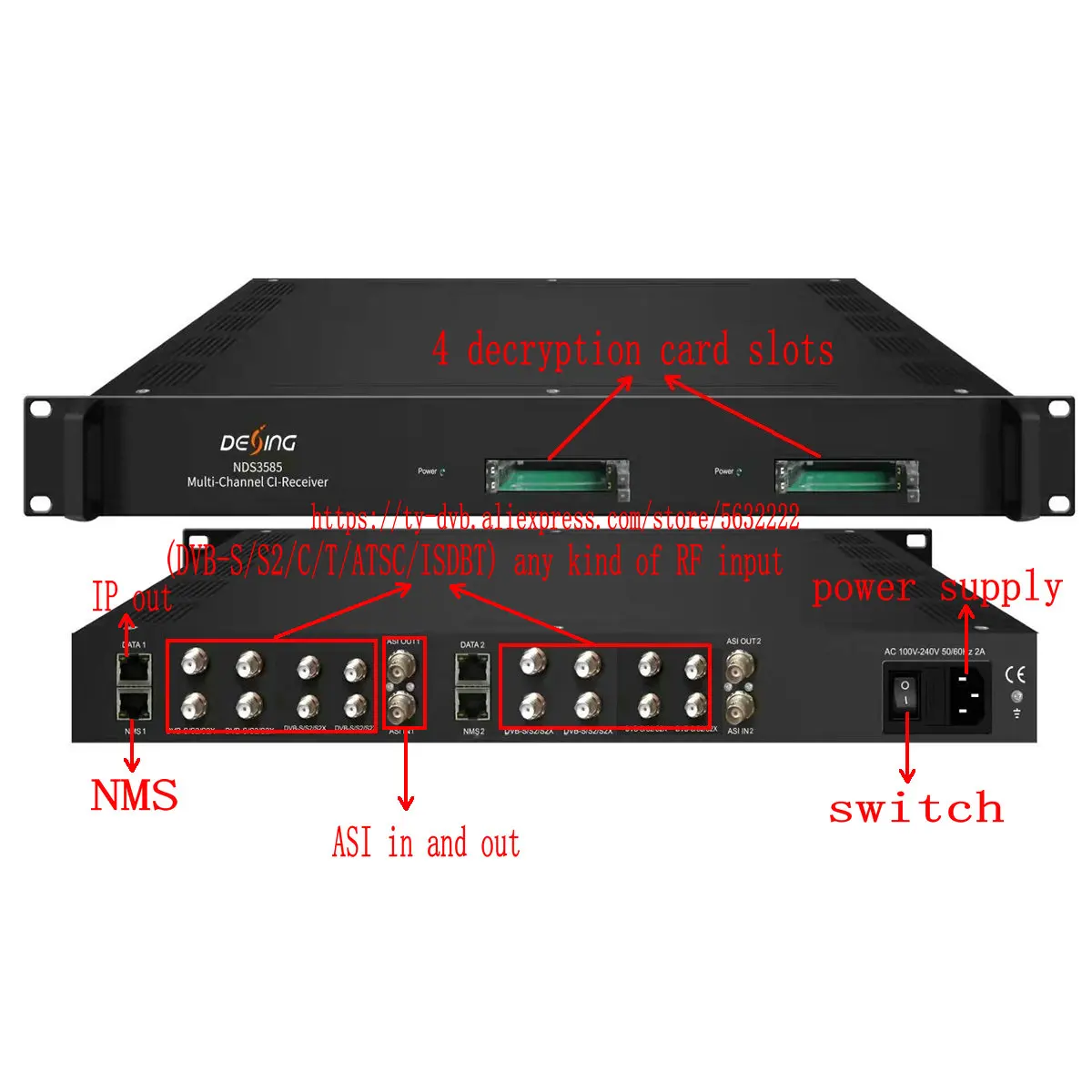 Para satisfacer las diversas necesidades de los clientes, cada módulo de demodulación del NDS3585 también está equipado con 1 entrada ASI y 16 entradas IP para re-mux, salida 1 MPTS y 128 SPTS, 1 puerto de salida ASI y 1 puerto de datos.