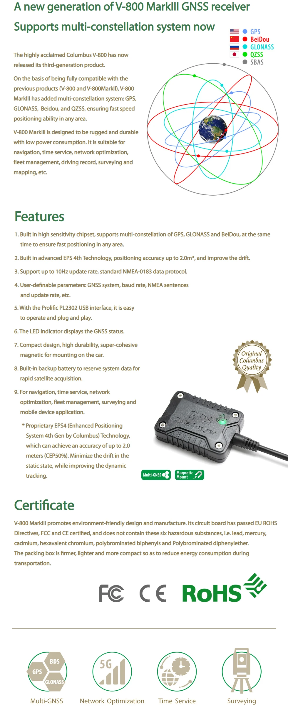Receptor GNSS compatible con GPS, GLONASS, BDS, QZSS, SBAS, 10MHz, precisión de posicionamiento, 2m, servicio de tiempo de navegación, V-800, MarkIII