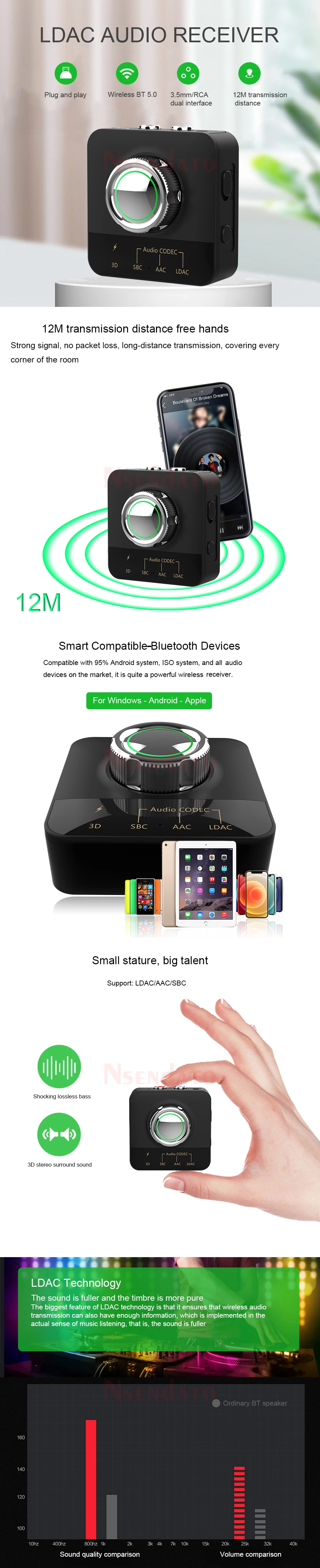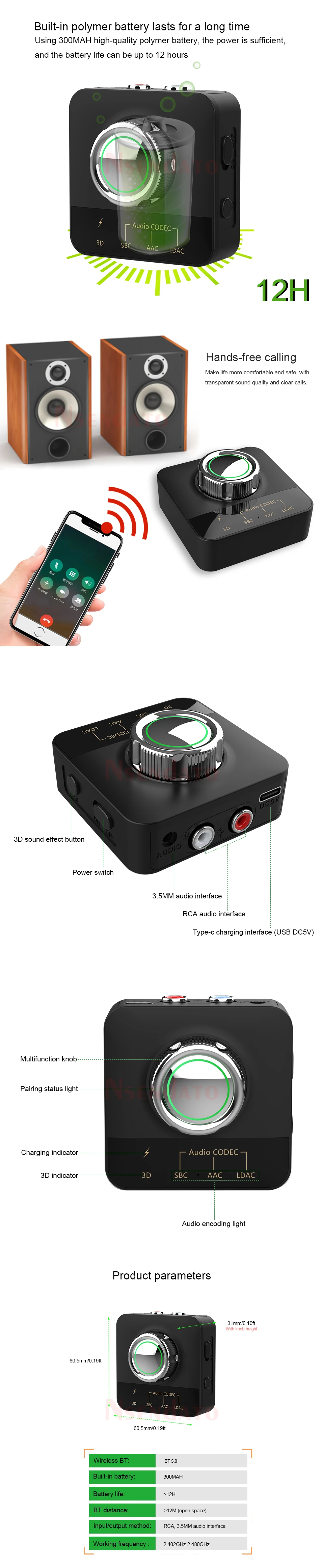 Receptor de música compatible con Bluetooth 5,0 con LDAC AAC 3D estéreo HiFi Audio adaptador inalámbrico RCA 3,5mm AUX para amplificador de coche de TV