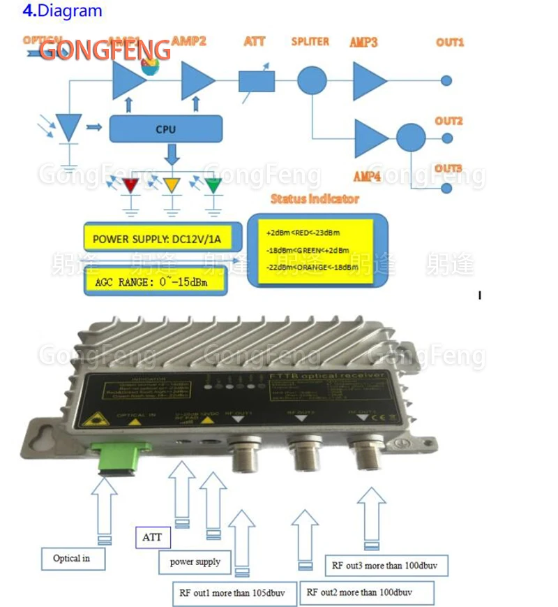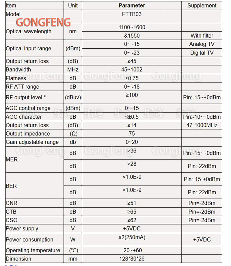 2. Adopta el módulo GaAs como módulo amplificador de RF, el rango de recepción óptica para señal digital puede alcanzar-23dBm y-15dBm para señal analógica.