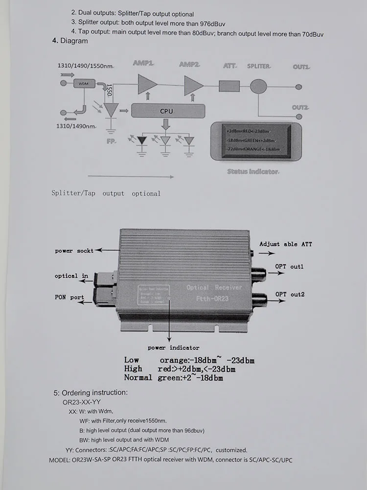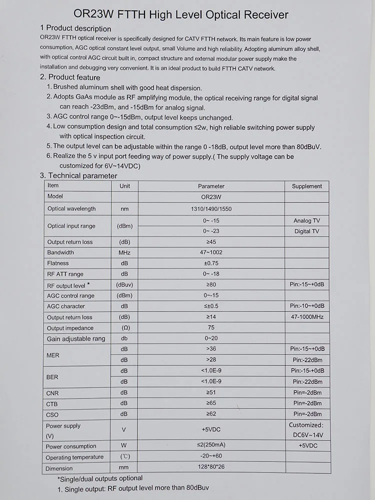 Descripción del producto: el producto OR23WD es un receptor óptico multiusos con bajo calor, alta fiabilidad y alto índice desarrollado por nuestra empresa para adaptarse a la diversificación de receptores de fibra óptica para hogares, edificios, receptor óptico de construcción, receptor óptico interior, integra la función del divisor, Puede separar la señal de red de banda ancha transmitida por la señal concéntrica al gato óptico, no afecta la transmisión de TV por cable, es muy bueno Un receptor óptico de tipo doméstico con demultiplexación