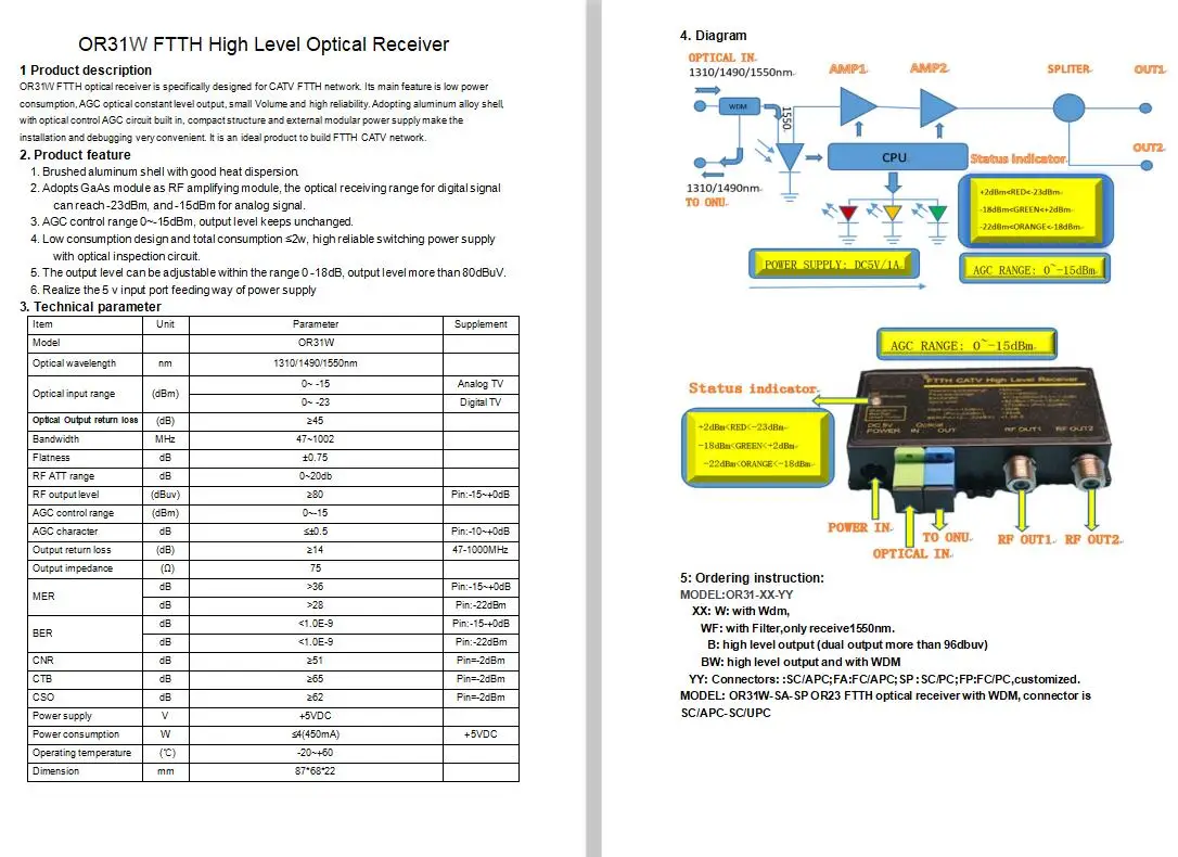 Descripción del producto: los productos de la serie o31 son un receptor óptico multiusos de bajo calor, alta fiabilidad y alto índice desarrollado por nuestra empresa para adaptarse a la diversificación de la fibra óptica en el hogar. Es adecuado para el receptor óptico doméstico, el edificio, el receptor óptico Louyu y el receptor óptico interior de transmisión de fibra óptica de TV por cable. Tiene la función de AGC óptico y se puede utilizar en la potencia de entrada óptica de 0 ~-dentro del rango de 15dBm, la salida de o31/WD se mantiene constante a 80dbm, Y la salida de no es inferior a 102dbm.