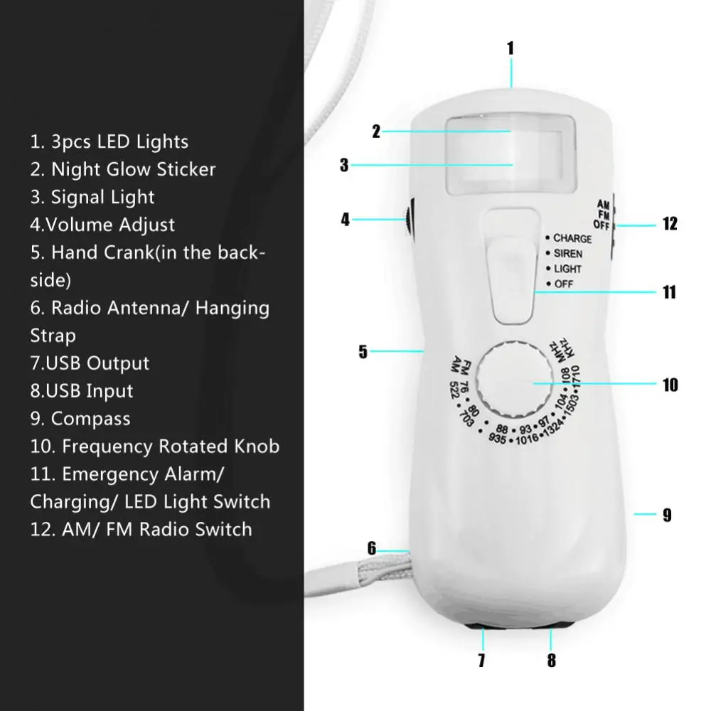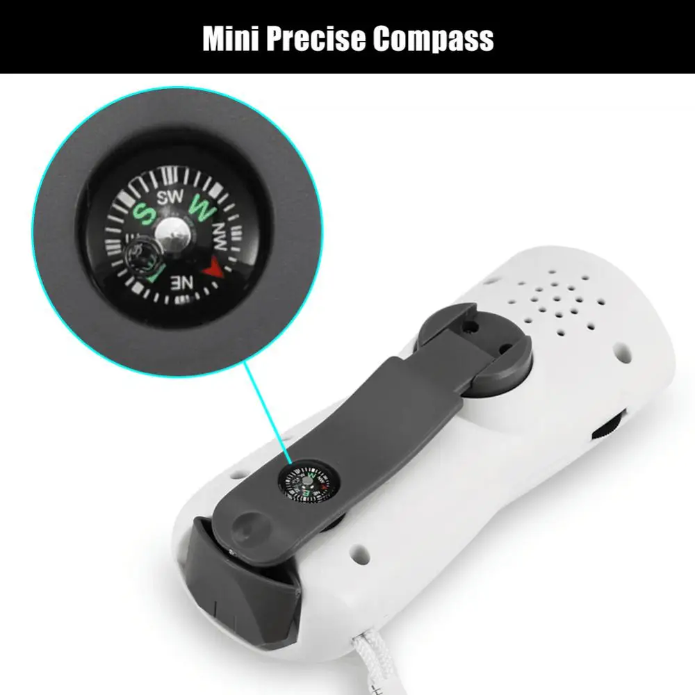 Esta es una radio multifuncional con linterna y Brújula de alto brillo. Se puede cargar con manivela o entrada USB, y se puede utilizar como fuente de alimentación de emergencia para sus teléfonos móviles u otros dispositivos digitales, para que pueda mantener suficiente energía para usted en cualquier momento y en cualquier lugar. Radio FM/ AM de alta sensibilidad incorporada, puede escuchar programas de radio dondequiera que esté. Ligero y portátil, adecuado para acampar, viajar y otras actividades al aire libre.
