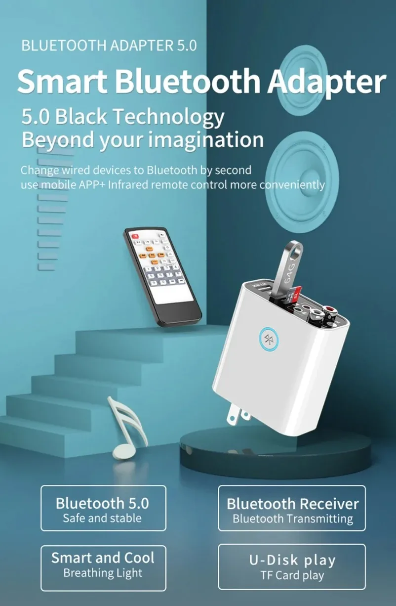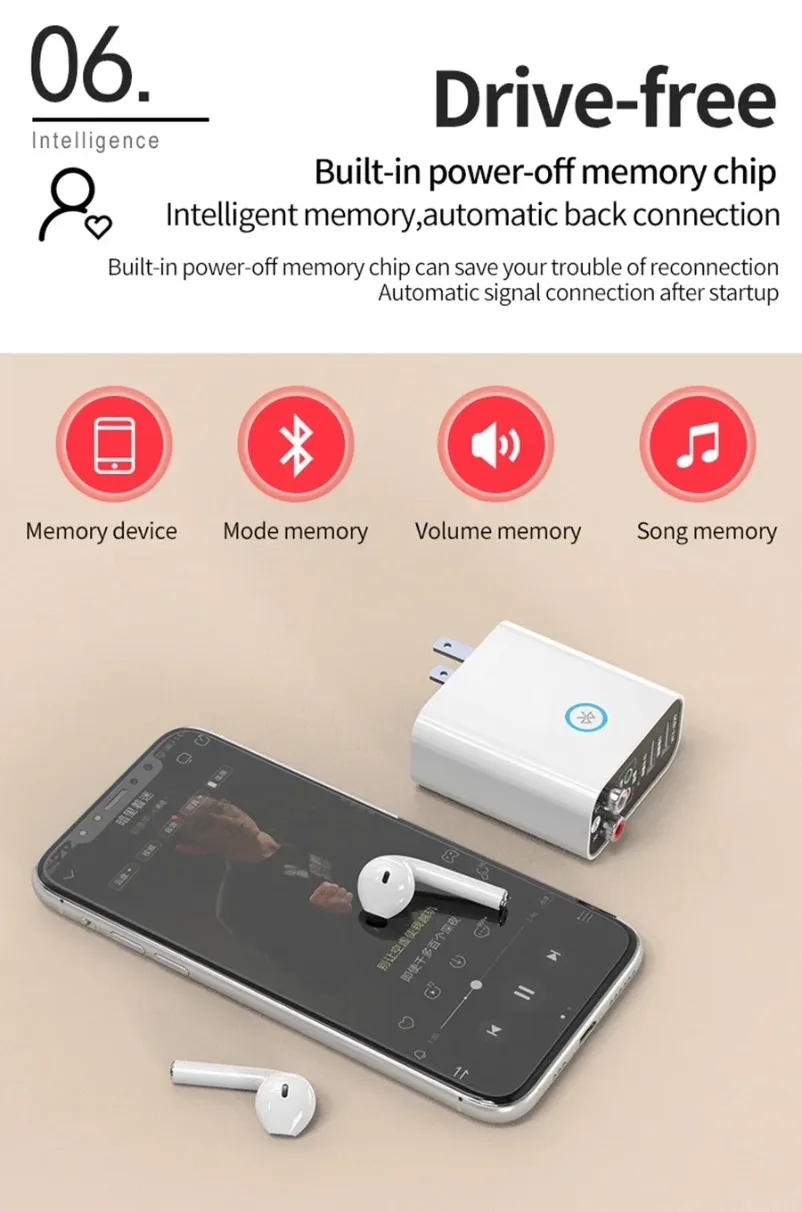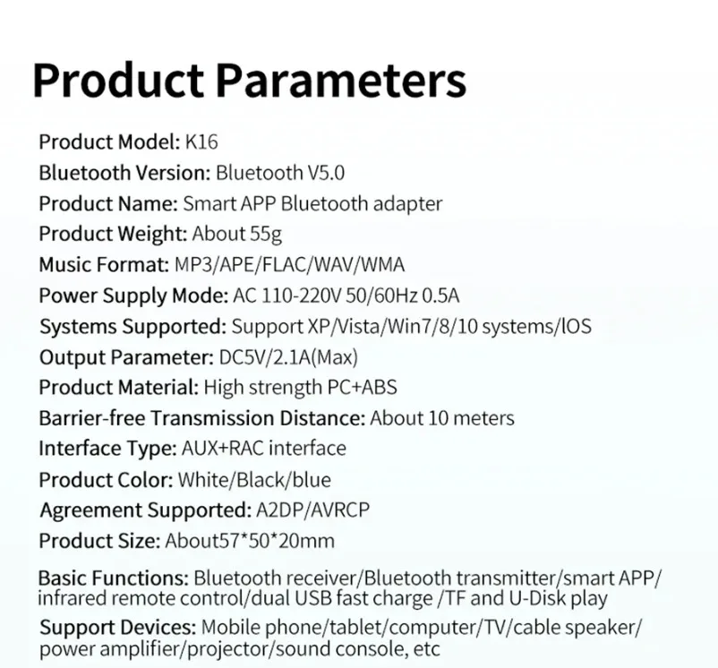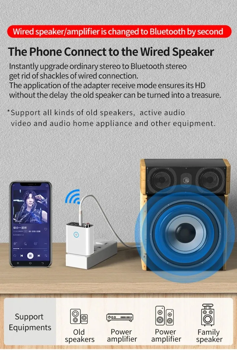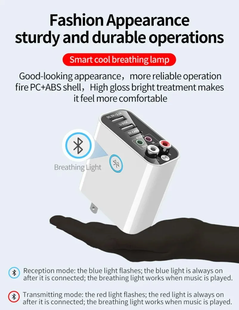 Fisiuro:1.Usando el chip Bluetooth 5.0;2.Admite recepción Bluetooth (RX) y transmisión Bluetooth (TX), dos funciones en una;3.Puede leer tarjetas TF/disco U, admite canciones en formato mp3/flac/wav/wam/ape;4.Control exclusivo de aplicaciones de teléfonos móviles, canción arriba y abajo/ajuste de volumen/ajuste de efectos de sonido/cambio de fuente de reproducción;5.Admite control remoto por infrarrojos, enciende/apaga/silencio/reproduce/pausa/canción arriba y abajo/volumen arriba/abajo/cambio de fuente de sonido;6.Admite fuente de alimentación de 110 ~ 220 V en línea, universal;7.Módulo de carga rápida QC2.0 incorporado, compatible con carga rápida USB dual de 2,1 A, carga fácil para teléfonos móviles, tabletas, etc.;8.Salida de interfaz dual AUX+RAC de 3,5 mm, modo RX Puede conectar 2 altavoces y otros equipos al mismo tiempo;9.La distancia de transmisión de Bluetooth es de 10 metros, chip decodificador HD incorporado;10.Color del producto: blanco/negro, lógica 65 g, tamaño: 57*50*20 mm (metal desnudo);11.Nueva actualización: lanzamiento para admitir los auriculares originales de Apple AirPods ( básicamente no son compatibles con los modelos del mercado);Descripción:Este adaptador bluetooth de cargador rápido USB está diseñado con salidas duales AUX y RAC, se puede conectar con un altavoz.El receptor transmisor de audio bluetooth admite entrada de 110-220 V y se puede utilizar en casi todo el mundo.El receptor transmisor de audio inalámbrico puede cargar un teléfono o una tableta y cuenta con puertos duales que pueden cargar dos dispositivos al mismo tiempo.El receptor transmisor bluetooth adopta un chip bluetooth 5.0 que puede proporcionar una conexión estable y rápida.El receptor transmisor bluetooth es cómodo de transportar o almacenar y no ocupa mucho espacio.Especificación:Material: ABS.Color: blanco/negroEnchufe: EE. UU./UETamaño: 57x50x20mm.Entrada: 110-220V.Salida: CC 5 V, 2,1 A.Versión de Bluetooth: Bluetooth 5.0.Alcance de Bluetooth: unos 10 metros.El paquete incluye:1x adaptador Bluetooth.1x cable de audio.1x Control remoto.1x manual de usuario.1 paquete al por menor.