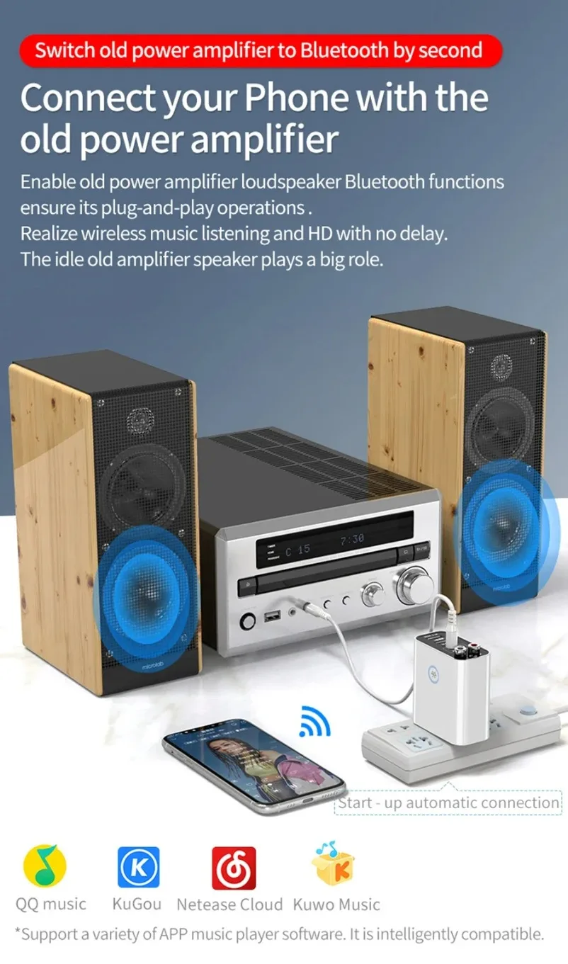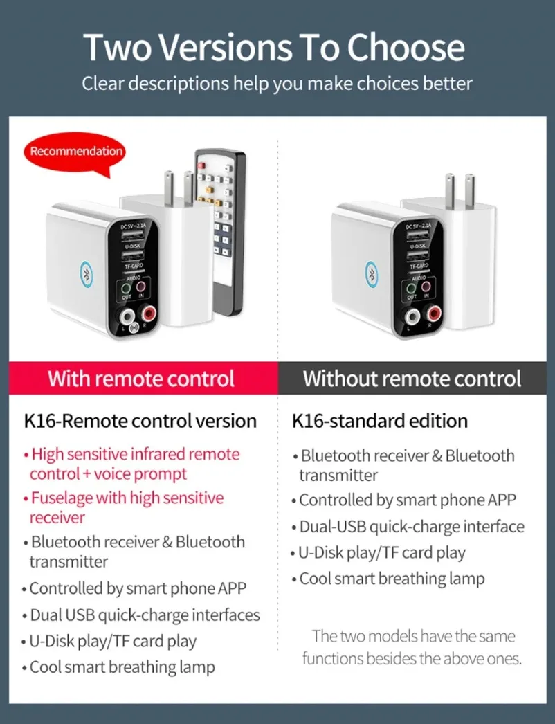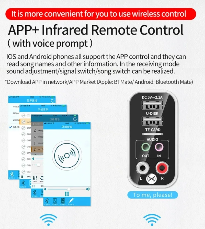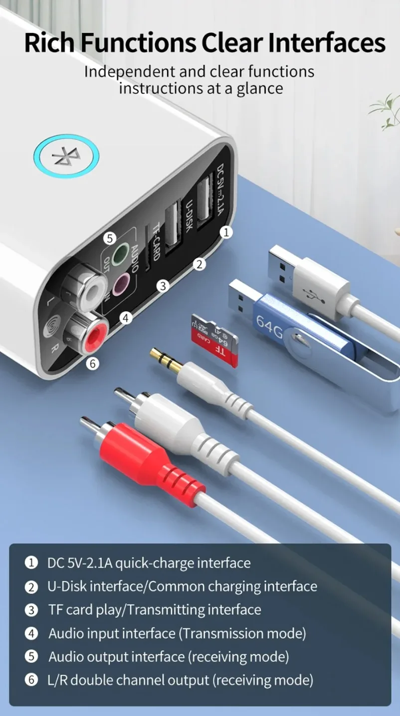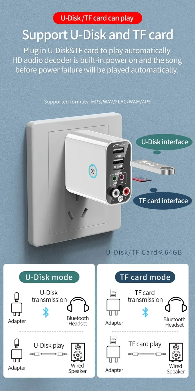 Fisiuro:1.Usando el chip Bluetooth 5.0;2.Admite recepción Bluetooth (RX) y transmisión Bluetooth (TX), dos funciones en una;3.Puede leer tarjetas TF/disco U, admite canciones en formato mp3/flac/wav/wam/ape;4.Control exclusivo de aplicaciones de teléfonos móviles, canción arriba y abajo/ajuste de volumen/ajuste de efectos de sonido/cambio de fuente de reproducción;5.Admite control remoto por infrarrojos, enciende/apaga/silencio/reproduce/pausa/canción arriba y abajo/volumen arriba/abajo/cambio de fuente de sonido;6.Admite fuente de alimentación de 110 ~ 220 V en línea, universal;7.Módulo de carga rápida QC2.0 incorporado, compatible con carga rápida USB dual de 2,1 A, carga fácil para teléfonos móviles, tabletas, etc.;8.Salida de interfaz dual AUX+RAC de 3,5 mm, modo RX Puede conectar 2 altavoces y otros equipos al mismo tiempo;9.La distancia de transmisión de Bluetooth es de 10 metros, chip decodificador HD incorporado;10.Color del producto: blanco/negro, lógica 65 g, tamaño: 57*50*20 mm (metal desnudo);11.Nueva actualización: lanzamiento para admitir los auriculares originales de Apple AirPods ( básicamente no son compatibles con los modelos del mercado);Descripción:Este adaptador bluetooth de cargador rápido USB está diseñado con salidas duales AUX y RAC, se puede conectar con un altavoz.El receptor transmisor de audio bluetooth admite entrada de 110-220 V y se puede utilizar en casi todo el mundo.El receptor transmisor de audio inalámbrico puede cargar un teléfono o una tableta y cuenta con puertos duales que pueden cargar dos dispositivos al mismo tiempo.El receptor transmisor bluetooth adopta un chip bluetooth 5.0 que puede proporcionar una conexión estable y rápida.El receptor transmisor bluetooth es cómodo de transportar o almacenar y no ocupa mucho espacio.Especificación:Material: ABS.Color: blanco/negroEnchufe: EE. UU./UETamaño: 57x50x20mm.Entrada: 110-220V.Salida: CC 5 V, 2,1 A.Versión de Bluetooth: Bluetooth 5.0.Alcance de Bluetooth: unos 10 metros.El paquete incluye:1x adaptador Bluetooth.1x cable de audio.1x Control remoto.1x manual de usuario.1 paquete al por menor.