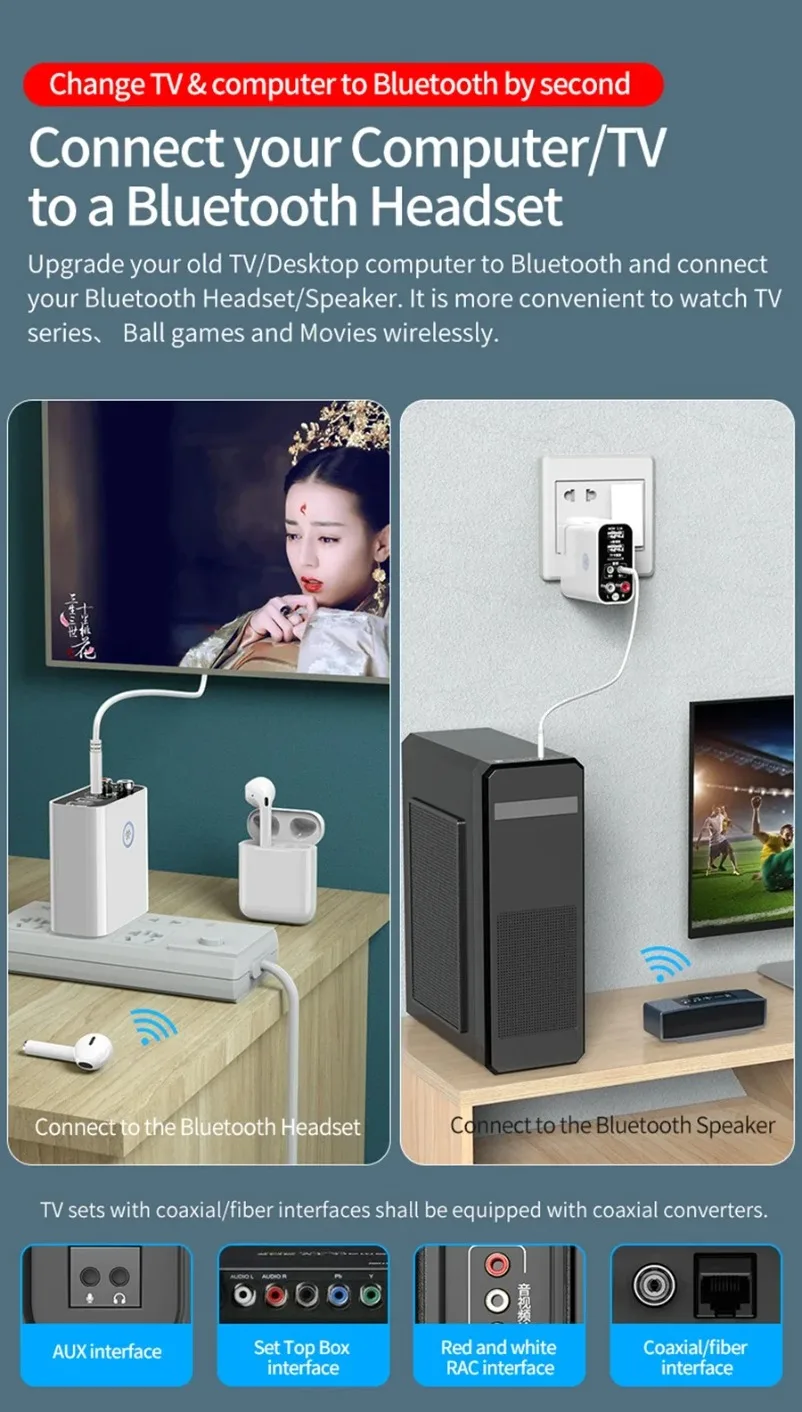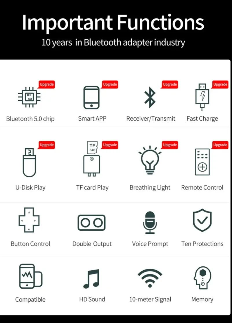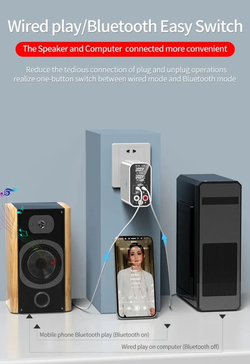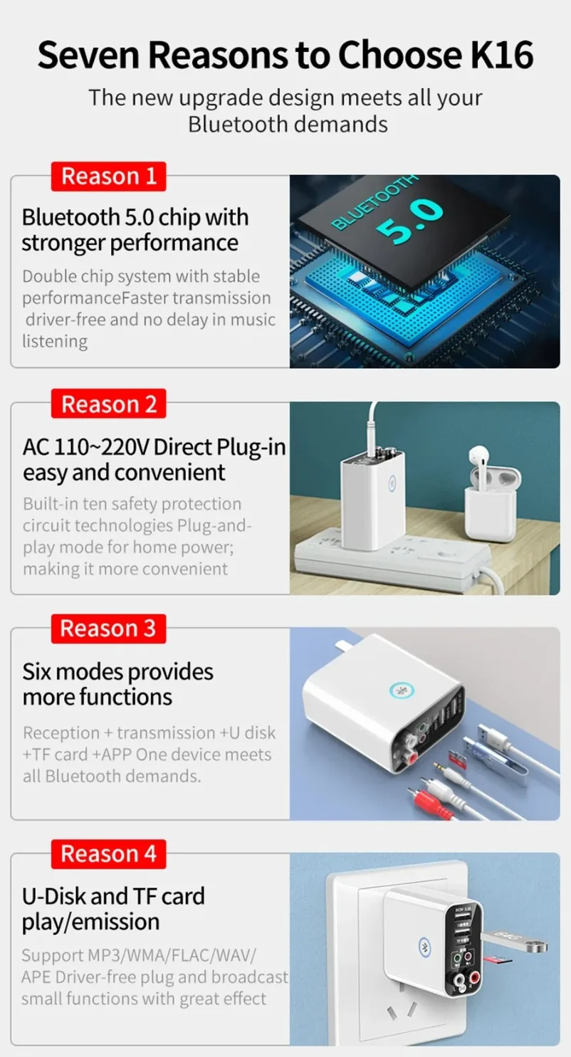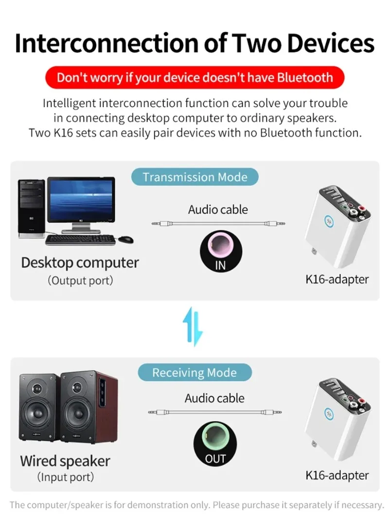 Fisiuro:1.Usando el chip Bluetooth 5.0;2.Admite recepción Bluetooth (RX) y transmisión Bluetooth (TX), dos funciones en una;3.Puede leer tarjetas TF/disco U, admite canciones en formato mp3/flac/wav/wam/ape;4.Control exclusivo de aplicaciones de teléfonos móviles, canción arriba y abajo/ajuste de volumen/ajuste de efectos de sonido/cambio de fuente de reproducción;5.Admite control remoto por infrarrojos, enciende/apaga/silencio/reproduce/pausa/canción arriba y abajo/volumen arriba/abajo/cambio de fuente de sonido;6.Admite fuente de alimentación de 110 ~ 220 V en línea, universal;7.Módulo de carga rápida QC2.0 incorporado, compatible con carga rápida USB dual de 2,1 A, carga fácil para teléfonos móviles, tabletas, etc.;8.Salida de interfaz dual AUX+RAC de 3,5 mm, modo RX Puede conectar 2 altavoces y otros equipos al mismo tiempo;9.La distancia de transmisión de Bluetooth es de 10 metros, chip decodificador HD incorporado;10.Color del producto: blanco/negro, lógica 65 g, tamaño: 57*50*20 mm (metal desnudo);11.Nueva actualización: lanzamiento para admitir los auriculares originales de Apple AirPods ( básicamente no son compatibles con los modelos del mercado);Descripción:Este adaptador bluetooth de cargador rápido USB está diseñado con salidas duales AUX y RAC, se puede conectar con un altavoz.El receptor transmisor de audio bluetooth admite entrada de 110-220 V y se puede utilizar en casi todo el mundo.El receptor transmisor de audio inalámbrico puede cargar un teléfono o una tableta y cuenta con puertos duales que pueden cargar dos dispositivos al mismo tiempo.El receptor transmisor bluetooth adopta un chip bluetooth 5.0 que puede proporcionar una conexión estable y rápida.El receptor transmisor bluetooth es cómodo de transportar o almacenar y no ocupa mucho espacio.Especificación:Material: ABS.Color: blanco/negroEnchufe: EE. UU./UETamaño: 57x50x20mm.Entrada: 110-220V.Salida: CC 5 V, 2,1 A.Versión de Bluetooth: Bluetooth 5.0.Alcance de Bluetooth: unos 10 metros.El paquete incluye:1x adaptador Bluetooth.1x cable de audio.1x Control remoto.1x manual de usuario.1 paquete al por menor.