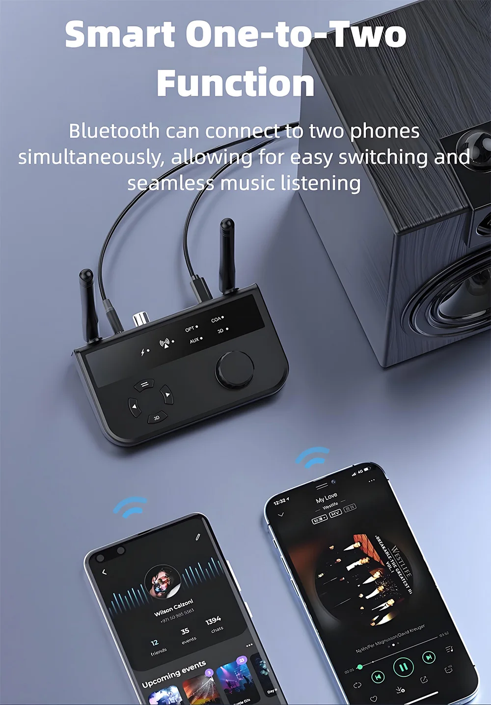 Conexión de uno a dos: Puede conectarse a dos dispositivos simultáneamente, lo que le permite cambiar fácilmente entre fuentes de audio.