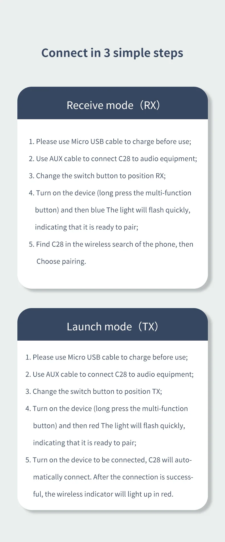 Modo de transmisión Bluetooth (TX): convierta el audio cableado en señal Bluetooth y transmítelo al dispositivo Bluetooth para su salida