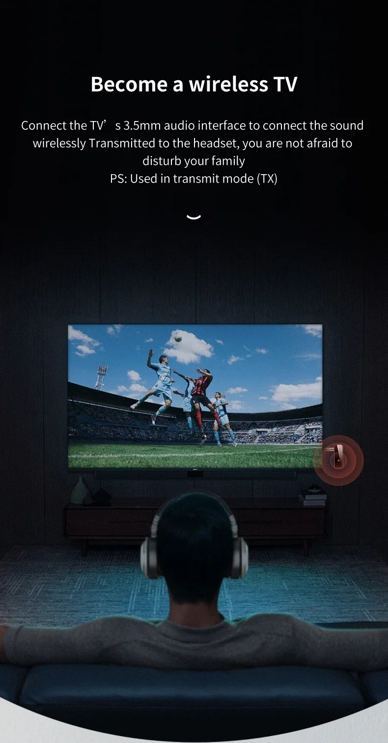 Conéctese a la interfaz de audio de 3,5 mm del televisor y transmita el sonido a los auriculares a través de Bluetooth, para que no tenga miedo de molestar a su familia cuando mira películas por la noche
