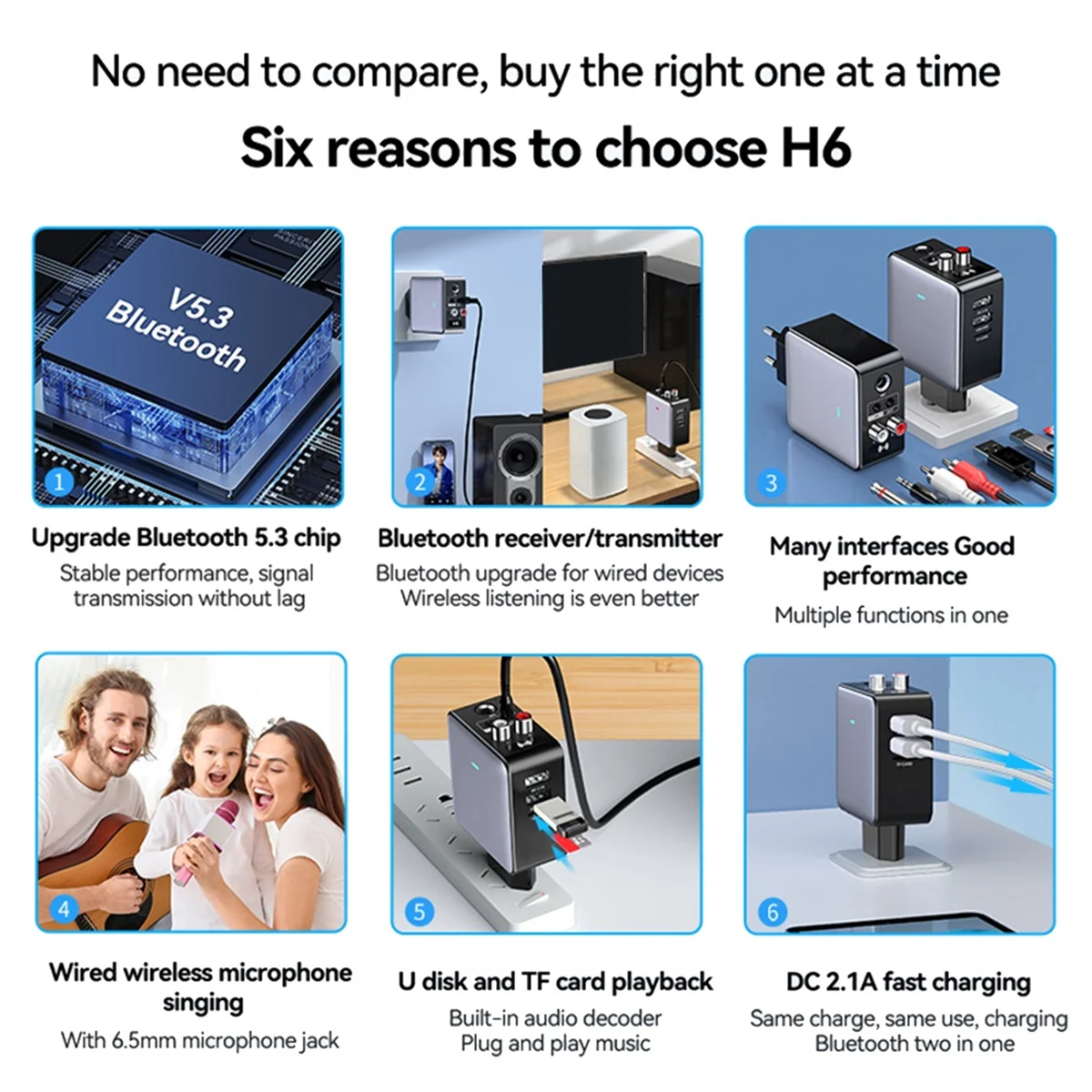 Receptor y transmisor de audio Bluetooth 5,3 multifuncional, el modo 2 en 1 es Compatible para su uso en una gama más amplia de dispositivos. Micrófono incorporado de alta definición de 6,5mm, admite acceso al micrófono para cantar, enchufar y cantar.