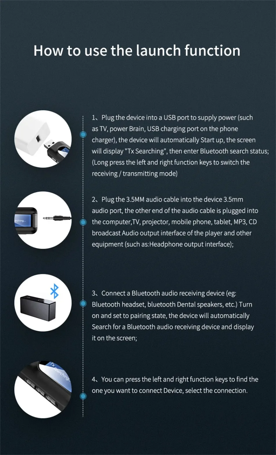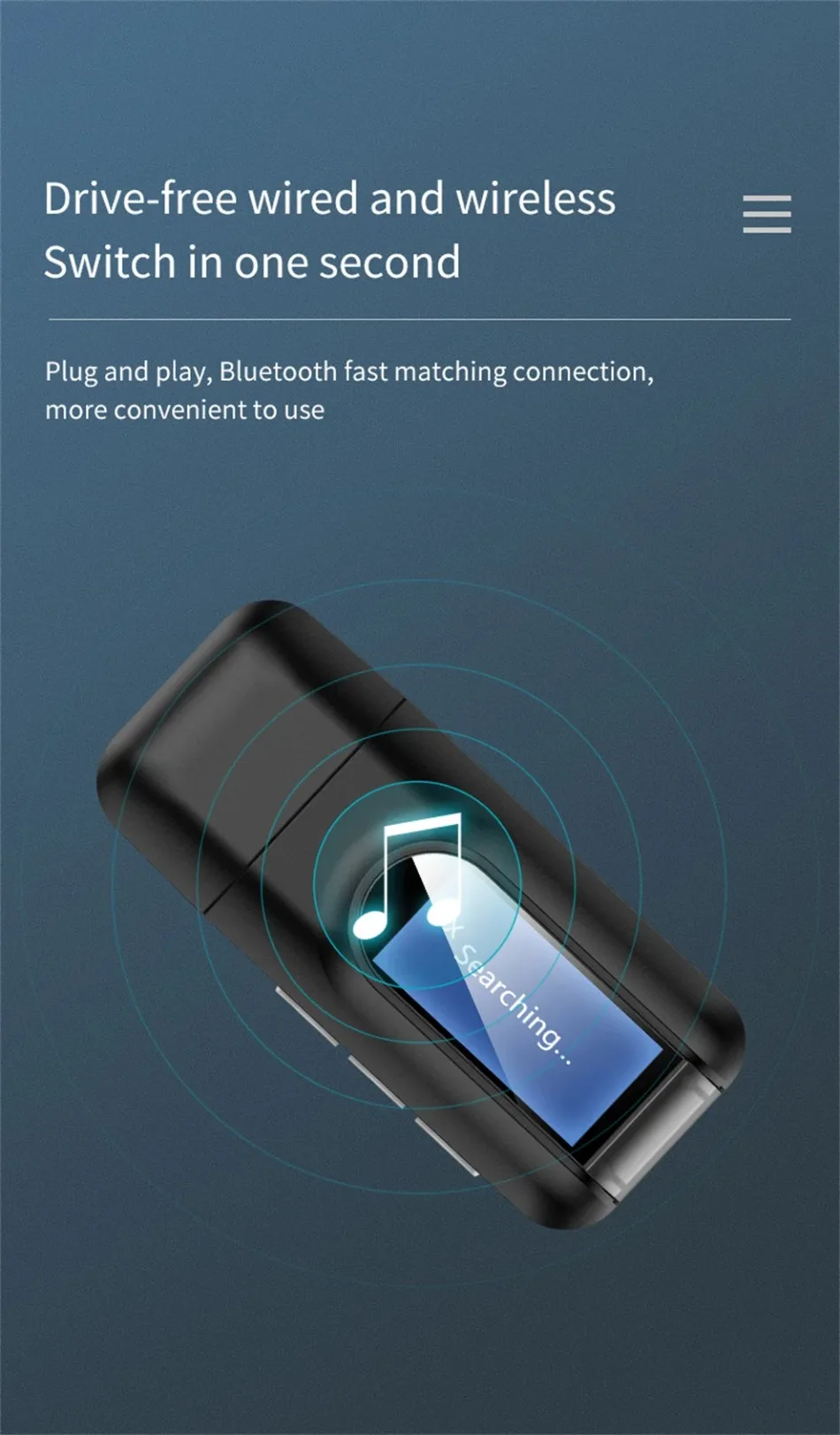 1. Nuevo diseño: ha llegado el primer receptor Bluetooth con pantalla LCD. Puede tener toda la información del estado de la transmisión inalámbrica desde un simple vistazo a la pantalla. Muestra el estado de la conexión Bluetooth.