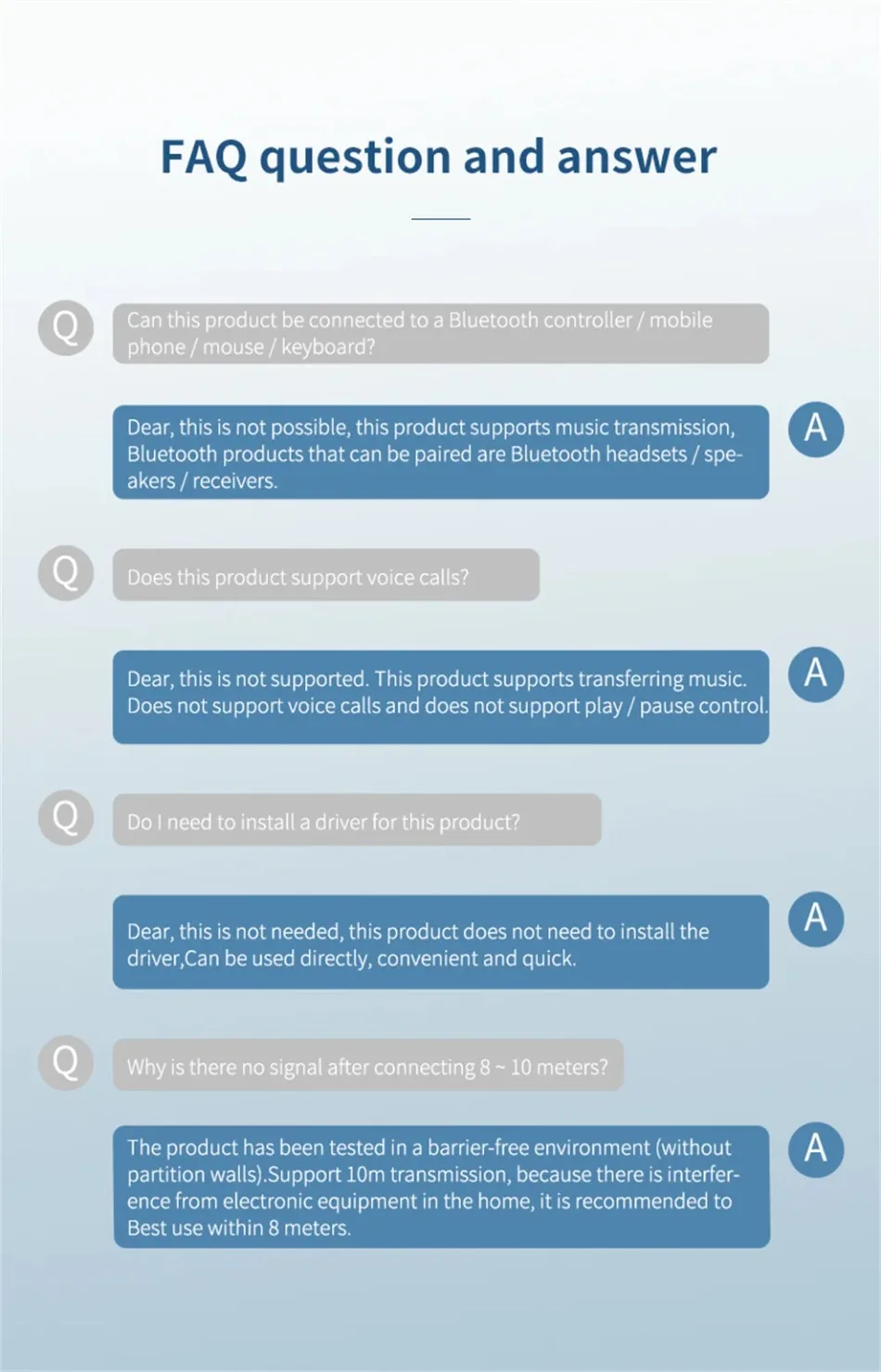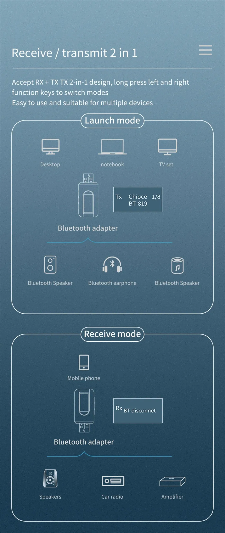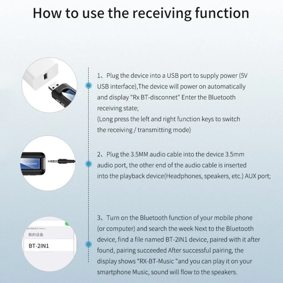 4. MODO DE RECEPCIÓN DEL TRANSMISOR: con diseño 2 en 1, usando este adaptador inalámbrico puedes enviar y recibir todo el audio libre y fácilmente. El transmisor permite a su TV, receptor AV, radio y otros dispositivos de fuente de audio domésticos transmitir música a sus auriculares o altavoces Bluetooth; el receptor permite a dispositivos sin Bluetooth como su estéreo doméstico o receptor AV transmitir música de forma inalámbrica desde su teléfono móvil/PC.
