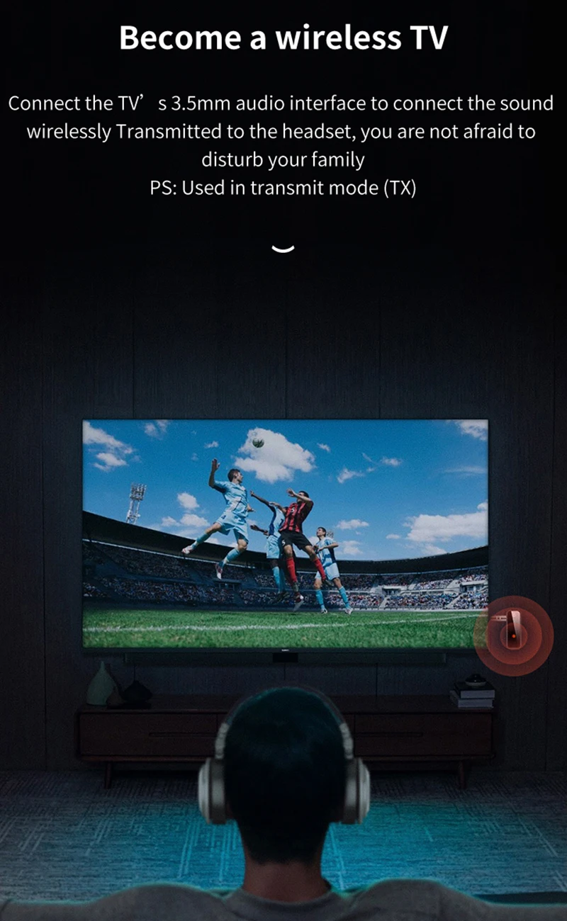 4.FUNCIÓN INALÁMBRICA:¿Quieres ver partidos de fútbol/béisbol/boxeo/golf/NBA tarde de la noche sin despertar a nadie?Esta es una gran elección para ti.La función de transmisor Bluetooth transmite audio de forma inalámbrica a parlantes o auriculares Bluetooth desde su televisor o dispositivos multimedia más antiguos, como reproductores de CD portátiles que carecen de Bluetooth incorporado.