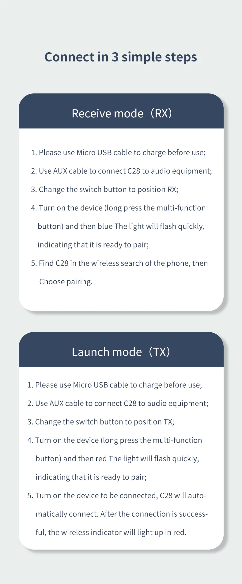 Como transmisor de audio Bluetooth:C28 está especialmente diseñado para dispositivos de audio (como MP3, MP4, TV y PC, etc.)sin función Bluetooth.Puede conectar el transmisor Bluetooth a los dispositivos de audio sin función Bluetooth a través del conector de audio de 3,5 mm incluido, cambiando estos dispositivos de audio a dispositivos de audio habilitados para Bluetooth y haciendo que funcionen con auriculares y altavoces habilitados para Bluetooth;