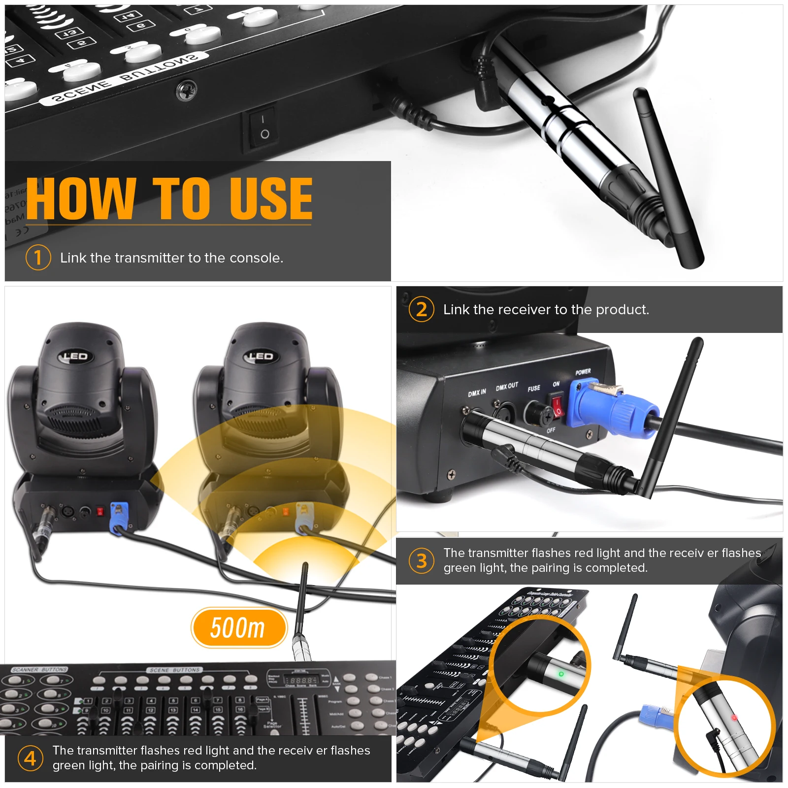 Modo de control: controlado por la consola DMX512, el transmisor se conecta a la consola DMX y el receptor se conecta a la lámpara.