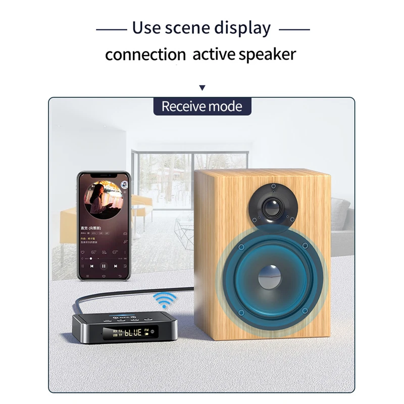 Diseño tres en uno de recepción (RX) compatible con Bluetooth, transmisión (TX) compatible con Bluetooth y transmisión FM.
