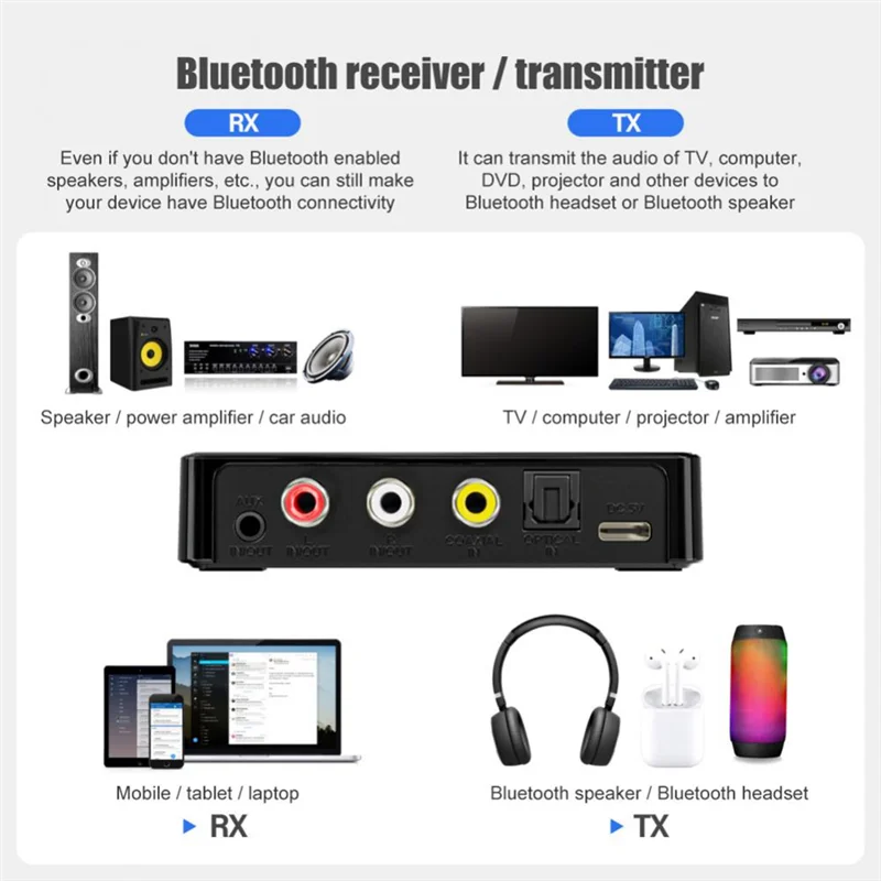 1. Usando el diseño de chip Bluetooth 5,0, mayor compatibilidad y estabilidad. 2. Receptor Bluetooth (RX), transmisión Bluetooth (TX) Diseño dos en uno. 3. Equipado LED con pantalla digital de alta definición, el estado de trabajo y el modo Bluetooth son claramente visibles. 4. Chip integrado de digital a analógico, compatible con fibra óptica digital, coaxial, AUX, interfaz RCA. 5. Actualice NFC la función, el teléfono móvil se puede conectar con un solo toque. 6. Batería de litio recargable incorporada de 500mAh, batería de larga duración 7. Compatible USB con (disco U), reproducción y transmisión de tarjetas TF. 8. Admite control remoto por infrarrojos de 5 ~ 8 metros, todo tipo de funciones están disponibles. 9. Micrófono incorporado de alta definición, compatible con escucha de música inalámbrica, llamadas manos libres, navegación. Modelo del producto: X6 Versión Bluetooth: Bluetooth V5.0 Batería: 3,7 V/500mAh Rango de transmisión: 10m Interfaz Aproximadamente: 3,5mm AUX/2RCA/COAXIAL/OPTICAL Parámetro de entrada: DC 5V-2.1A(MAX) Protocolo de soporte: A2DP/AVRCP Método de uso: Drive Free Funciones básicas: Recepción de Bluetooth, lanzamiento de Bluetooth, reproducción de disco U, reproducción de tarjeta TF, control remoto por infrarrojos, funcionamiento clave, fibra digital/entrada coaxial, dispositivos compatibles con NFC: todo tipo de altavoces, ordenadores de sobremesa, portátiles, TV, amplificador de potencia, modo receptor de proyector para altavoz con cable/altavoz doméstico/amplificador de potencia/auriculares/kit de coche modo transmisor para TV/PC/proyector/amplificador de potencia/caja de TV. Color: negro Material:ABS Contenido del paquete: 1 x adaptador Bluetooth 1 x línea AUX 1 x cable RCA 1 x cable de carga tipo C 1 x Control Remoto Solo el contenido del paquete anterior, otros productos no están incluidos. Nota: El reflejo de la luz y las diferentes pantallas pueden hacer que el color del elemento en la imagen sea un poco diferente del real. El error de medición permitido es +/- 1-3cm.