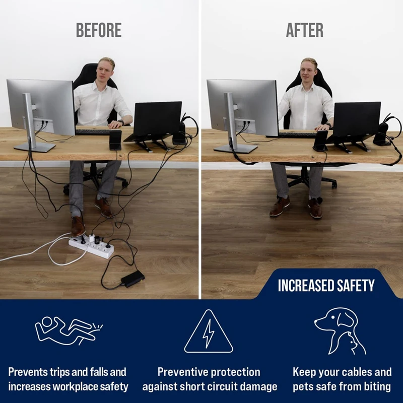 Cabe cómodamente debajo de la mesa para ocultar cables.Coloque la bandeja de gestión de cables debajo del escritorio para organizar todos los clips de cables incluidos y mantener el escritorio ordenado.