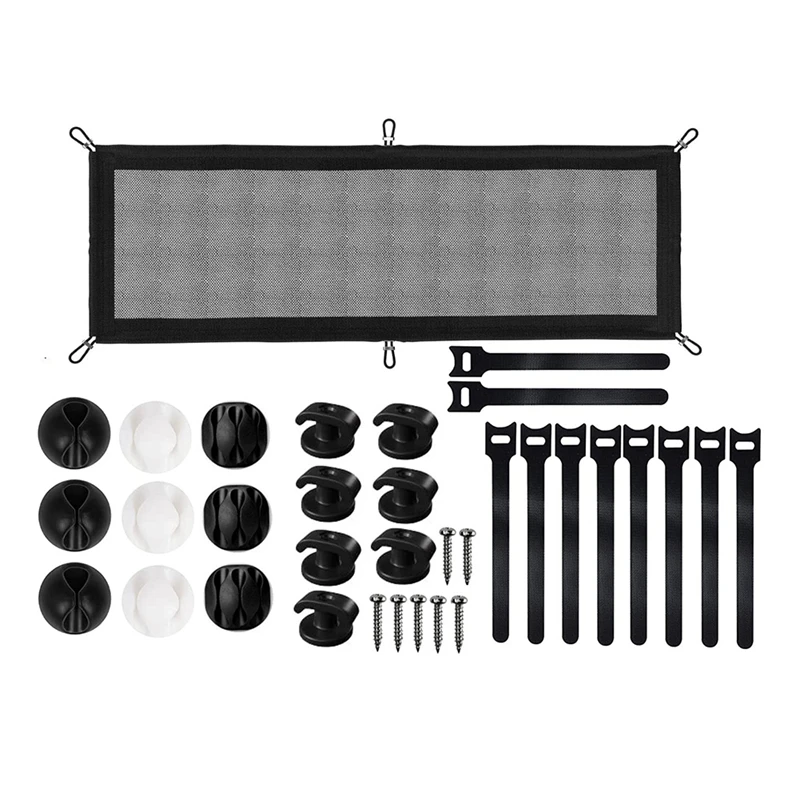 Nuestra red de gestión de cables debajo de la mesa: flexible y microelástica, amplía el espacio de uso, material suave, peso ligero, uso multidireccional.