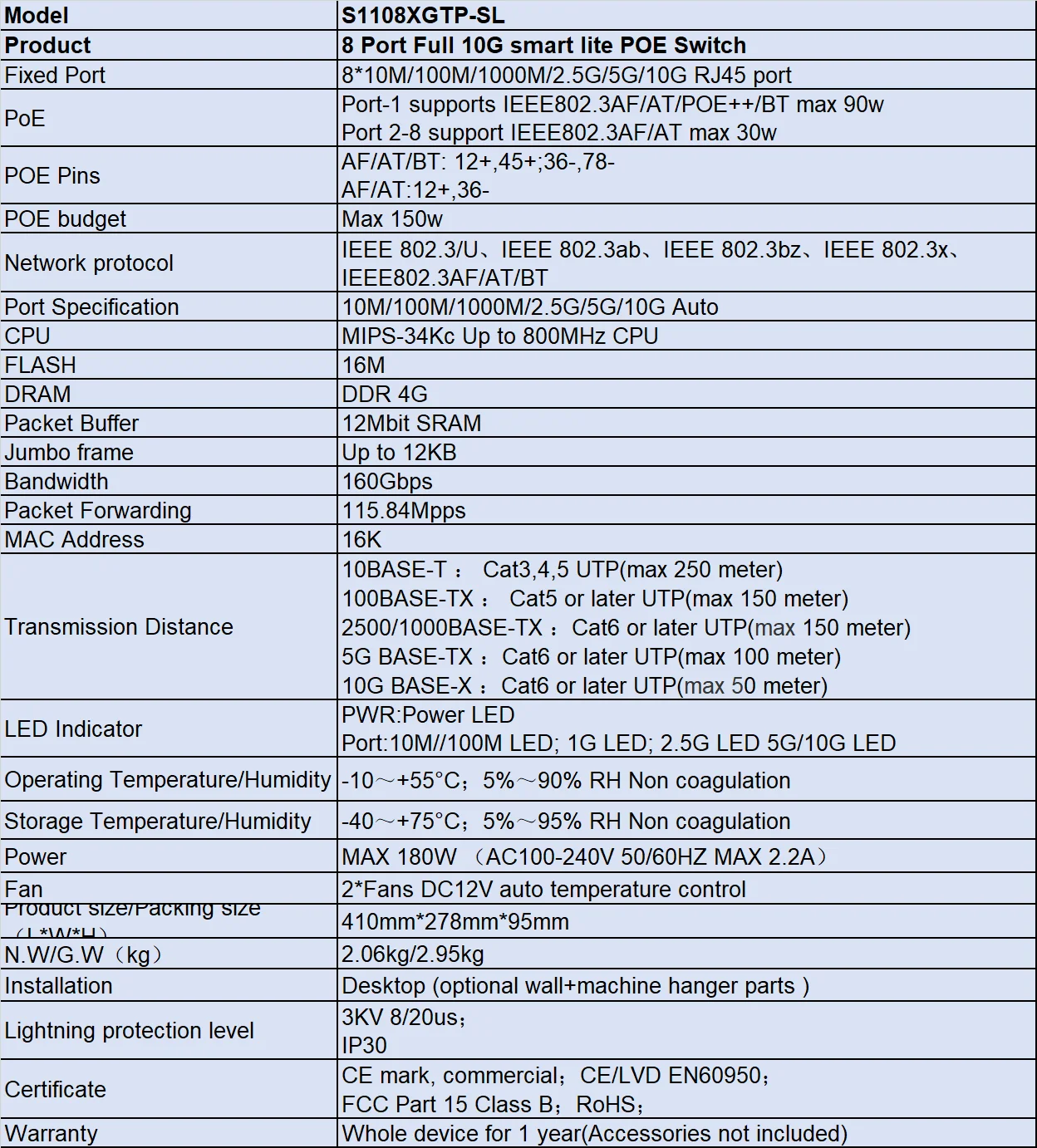 Se trata de un interruptor gestionado de 8 puertos 10M/100M/1000M/2,5G/10G inteligente autoadaptable. Proporciona 8 puertos POE activos. Utiliza el mecanismo de almacenamiento y reenvío e integra caché de alta capacidad para garantizar el reenvío de velocidad de línea sin bloqueo en todos los puertos. Por lo tanto, es adecuado para aplicaciones de gran ancho de banda.