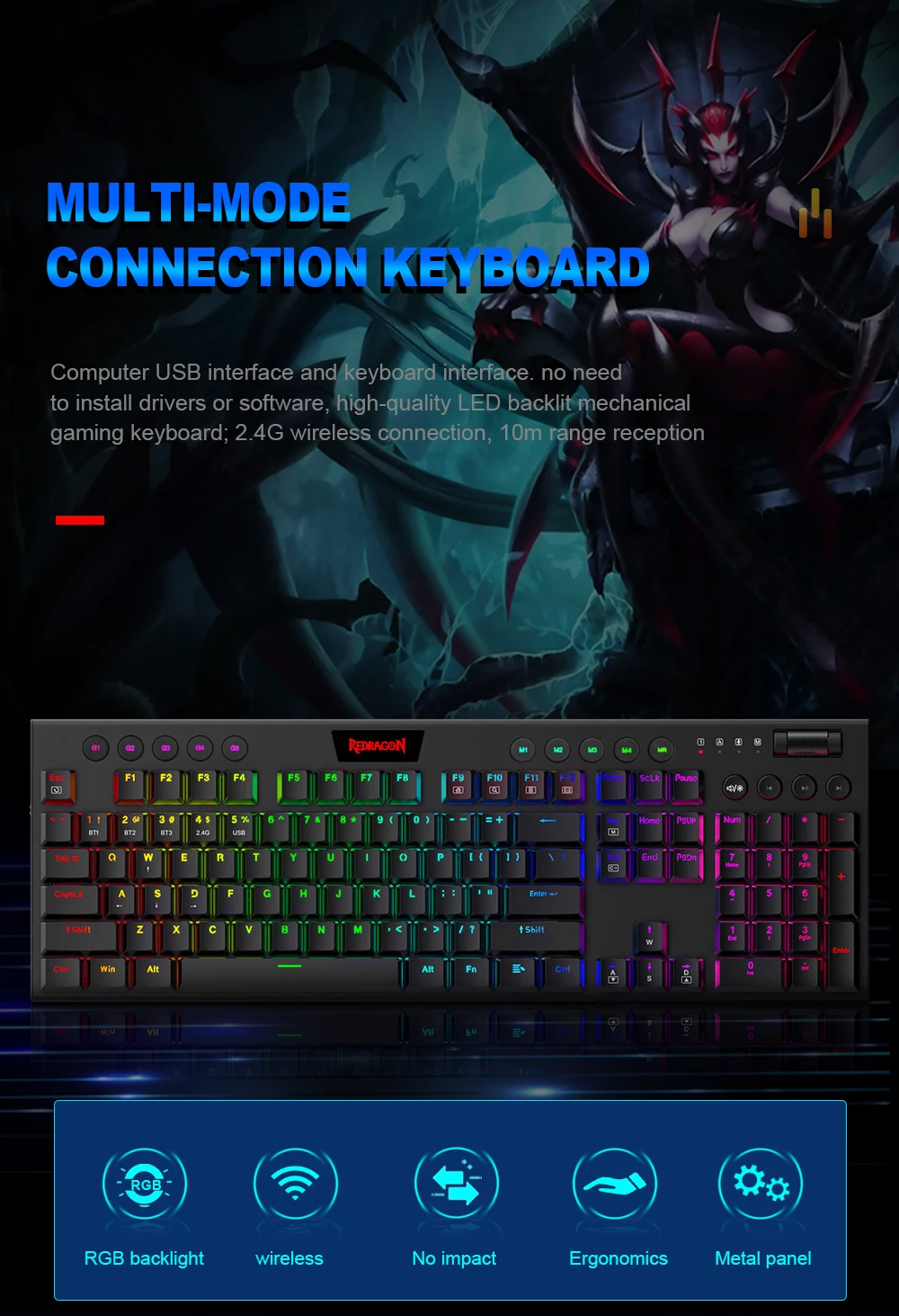 Comprar Redragon Horus K618 RGB compatible con Bluetooth 5,0 inalámbrico USB 2,4G 3 Modo teclado mecánico para juegos 104 teclas ordenador