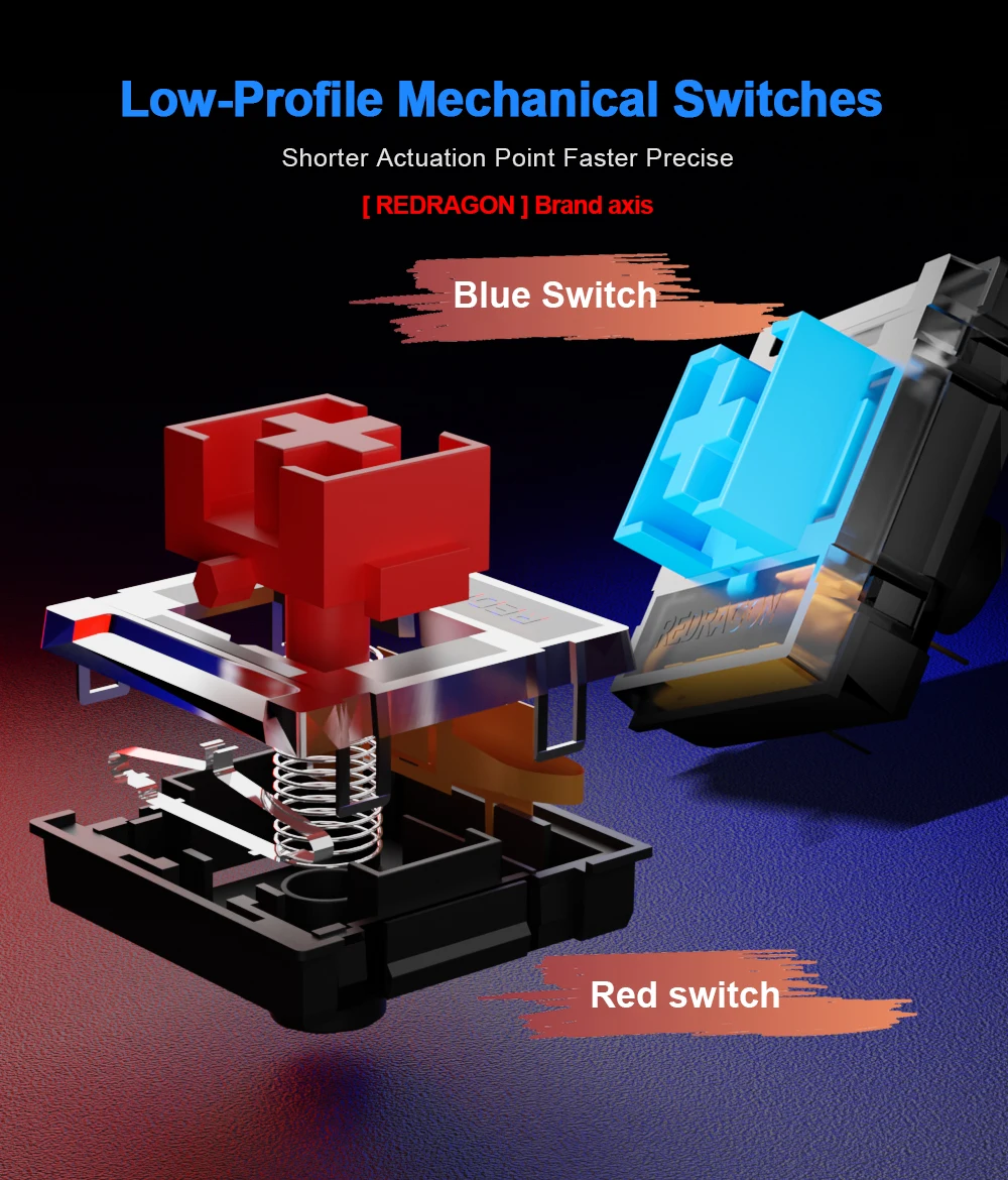 30 % ultrafino cortado: perfil bajo diseñado en todo el teclado desde el tablero inferior, interruptores rojos de perfil medio bajo (fuerza de actuación: 40 g) y las teclas superiores tienen como objetivo acortar la distancia de accionamiento tanto como sea posible.