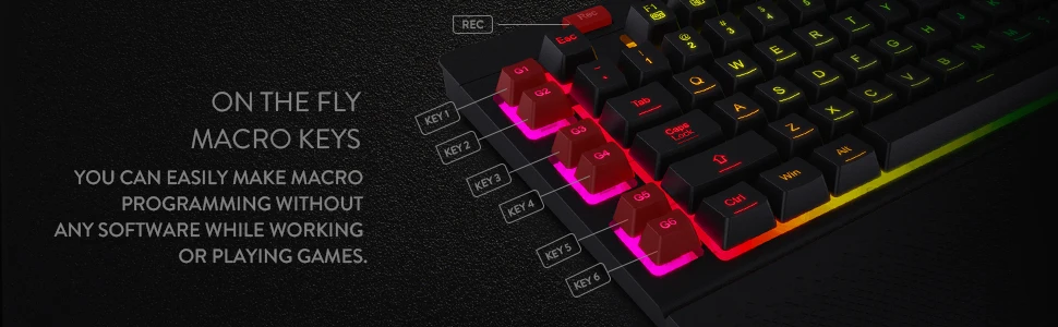 *6 teclas macro integradas: 6 teclas macro integradas (G1~G6) son programables y funcionan en la marcha sin ningún software adicional.Las teclas son fáciles de editar y pueden realizar una variedad de macros diferentes.