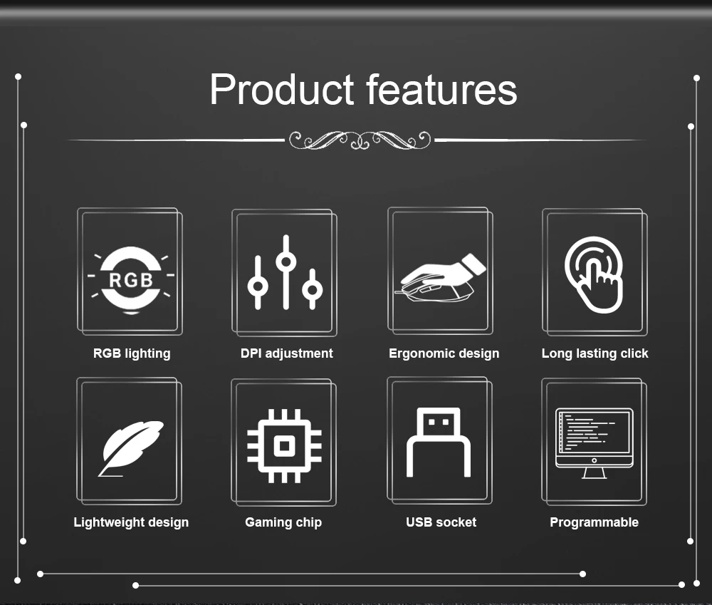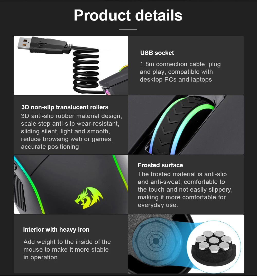 CARACTERÍSTICAS DEL RATÓN PARA JUEGOS PARA PC DE ALTA GAMA; Características del ratón Redragon; Rueda de desplazamiento antideslizante texturizada, almohadillas de pies de TEFLON suaves y duraderas para un máximo control de juego.7 botones programables.Total de 8 botones.El mouse funciona muy bien con los teclados para juegos Redragon.Cable de fibra trenzada de alta velocidad resistente de 3 mm y un conector USB libre de corrosión chapado en oro para una conexión confiable
