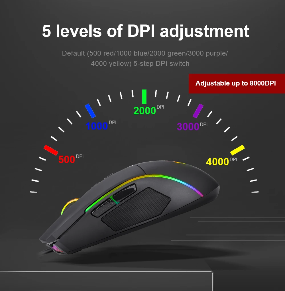 RATÓN PARA JUEGOS USB CON CABLEADO; Diseñado para jugadores de PC: Ratón ergonómico para juegos redragon "Lonewolf" retroiluminado RGB de hasta 8000 ppp (rápido en el usuario de mosca con cambio de DPI de 500/1000/2000/3000/4000) aceleración de 35G.El sensor de alta precisión ofrece una precisión milimétrica, mientras que los microinterruptores de grado de juego tienen una vida útil nominal de 5 millones de clics para garantizar longevidad, mayor durabilidad y capacidad de respuesta extrema, brindándole una ventaja aún mayor sobre su competencia.